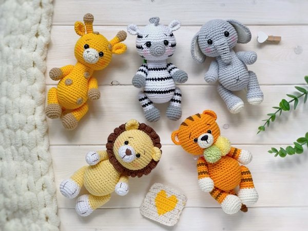 Folgen Sie diesen Häkelmustern, um eine ganze Reihe von Safari-Themen zu erstellen. Das Set enthält folgende Tiere: Löwe, Zebra, Elefant, Giraffe und Tiger. Alle Tiere sind so hell und die Größe ist für kleine Babyhände geeignet.