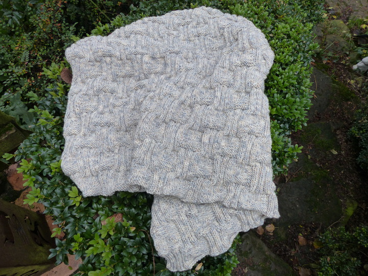 Ich habe mit Schachenmayr Extrafine Merino 120 gestrickt. Die Decke liegend und ungedehnt hat eine Größe von 80 x 60 cm. Verbraucht habe ich 350 Gramm mit Nadelstärke 4