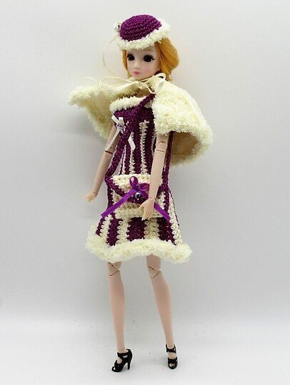 Diese wunderschöne Streifenkleid kann ganz unterschiedlich wirken, je nachdem mit welchem Garn du es häkelst. Der Saum und der Halsausschnitt werden von einem kuscheigen Rand umschmeichelt. Aus dem gleichen Material kannst du ein passendes Schultercape häkeln. Das kecke Hütchen wird ebenfalls mit Fell umsäumt. Passend gibt es eine Schultertasche.