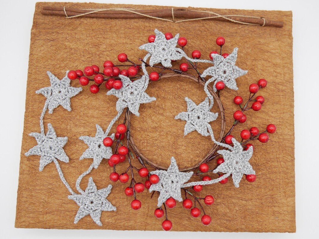 Die Girlande / Kette wird in einem Stück gearbeitet, es gibt nur den Anfangs und Endfaden zum vernähen.