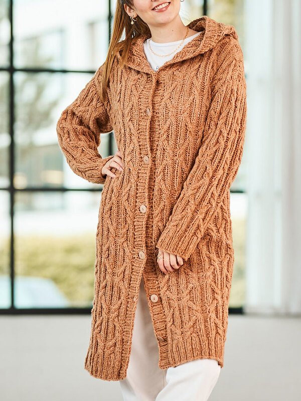 Was für eine tolle lange Jacke! Das interessante Zopfmuster macht dieses Schätzchen zu etwas besonderem.