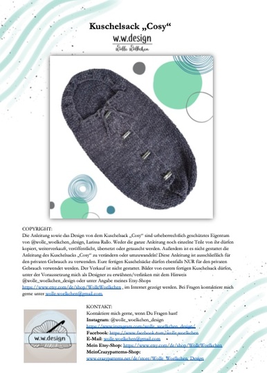 Die Anleitung sowie das Design von dem Pucksack "Cosy" sind urheberrechtlich geschütztes Eigentum von wolle_woelkchen_design. Weder die ganze Anleitung noch einzelne Teile von ihr dürfen kopiert, weiterverkauft, veröffentlicht, übersetzt oder getauscht werden. Außerdem ist es nicht gestattet die Anleitung des Kuschelsacks „Cosy“ zu verändern oder umzuwandeln! Diese Anleitung ist ausschließlich für den privaten Gebrauch zu verwenden. Bilder von eurem fertigen Pucksack dürfen, unter der Voraussetzung mich als Designer zu erwähnen/verlinken mit dem Hinweis wolle_woelkchen_design oder unter Angabe meines crazypatterns-Shops, im Internet gezeigt werden. Dies gilt ebenso für den Verkauf von eurem fertigen „Cosy“-Pucksack. Er darf nur in limitierter Anzahl hergestellt und nicht für Werbezwecke genutzt werden. Bei Fragen kontaktiere mich gerne unter wolle.woelkchen@gmail.com