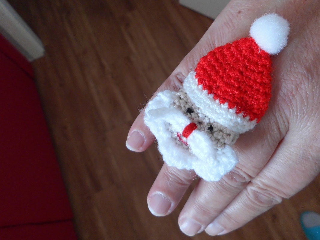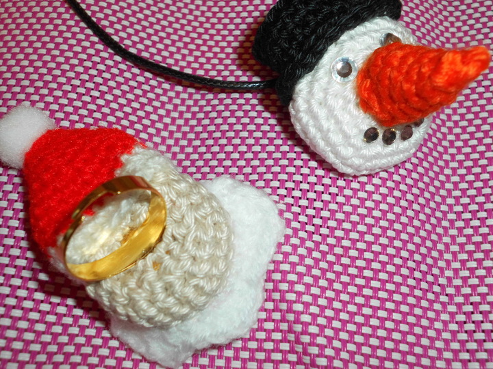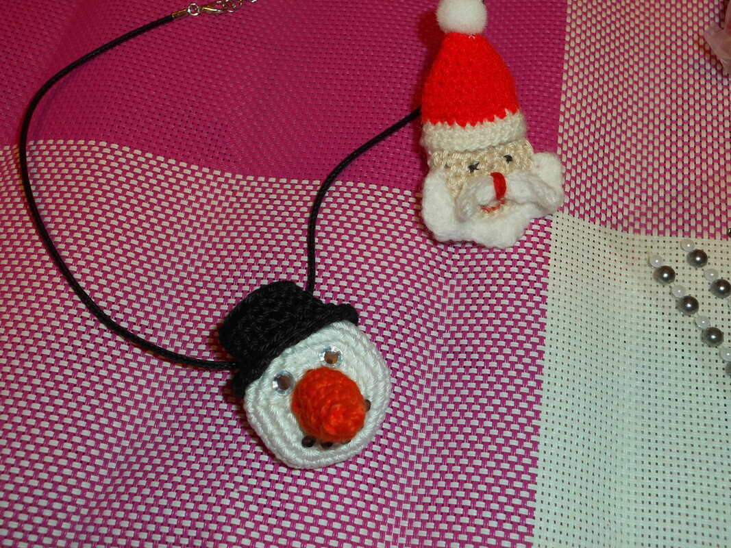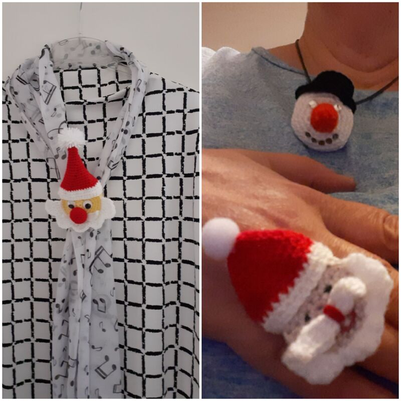 Gelegenheit ein paar Wollreste zu verarbeiten mit diesem Schmuck aus Wolle. Der Weihnachtsmann als Fingerring oder Tuchhalter und der Schneemann als Kettenanhänger. Hingucker des Tages.