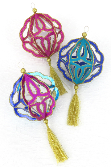 Die Anhänger sind ca. 6,5 cm breit und ca. 14 cm hoch. Nur Kugeln ohne Quasten, Perlen und Ösen sind ca. 7 cm hoch.
