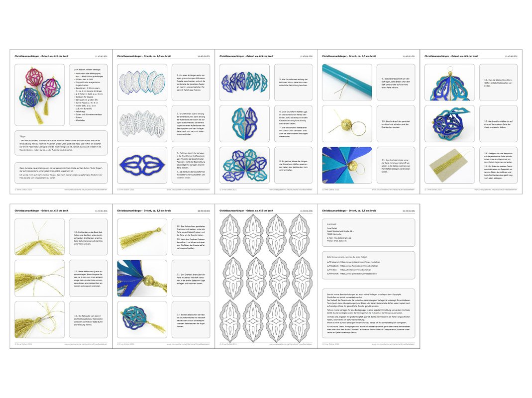 Um diese Anhänger nachzuarbeiten, sollst du gut mit Schere und Cutter umgehen können, wissen, wie man Faltlinien einprägt und Grundformen faltet. Auch sollst du im Idealfall bereits mit Glitter-Liner und Klebstoff gearbeitet haben und feinmotorisch begabt sein.