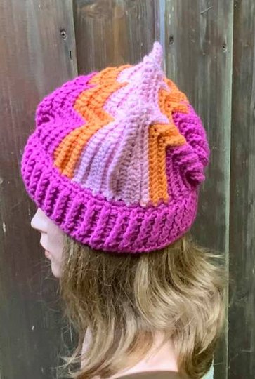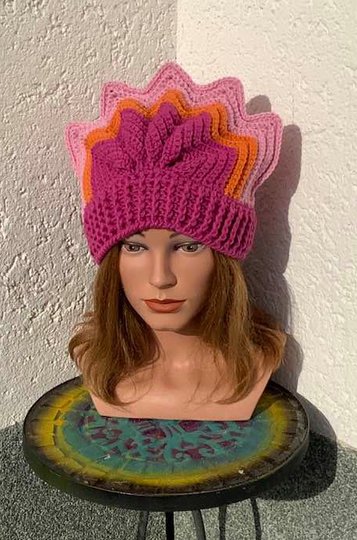 Die Mütze "HAPPY TARAK" hat eine echt außergewöhnliche Form...wirklich sehr speziell....man kann die Mütze auf 2 Arten tragen: die Spitzen gerade- oder quer über dem Scheitel (wie ein Irokese...)