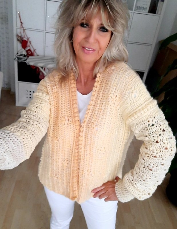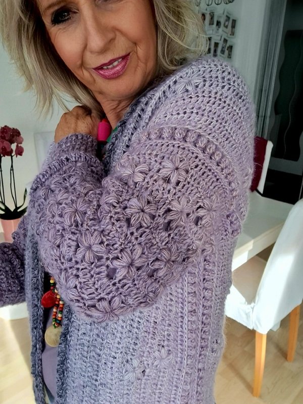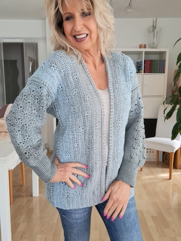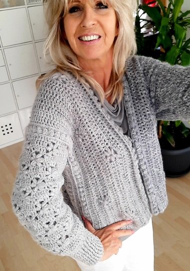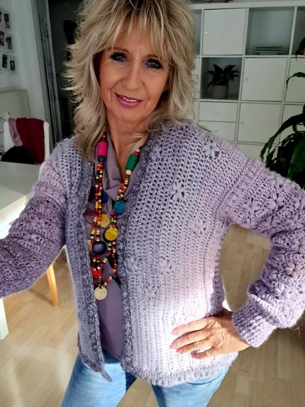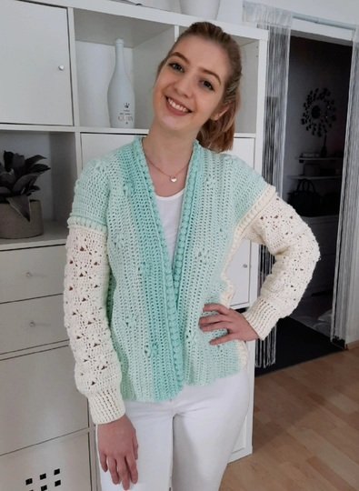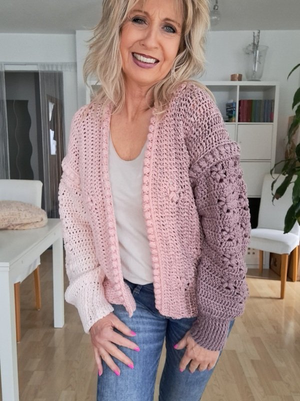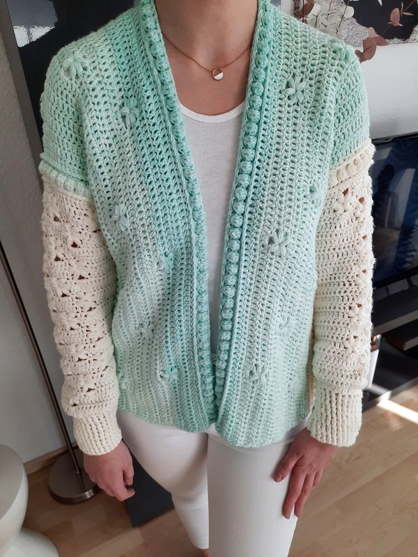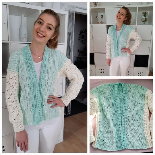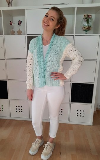 Die Jacke wird an einem Stück und quer gehäkelt, dadurch eignet sie sich perfekt