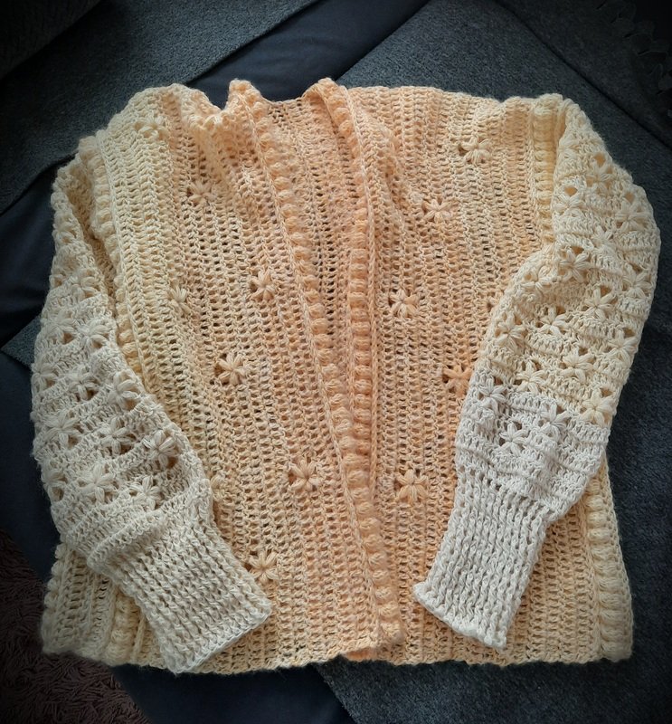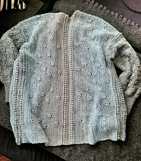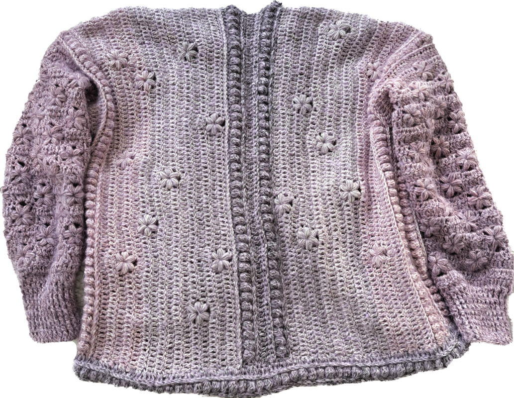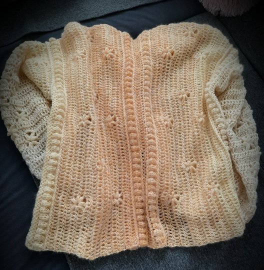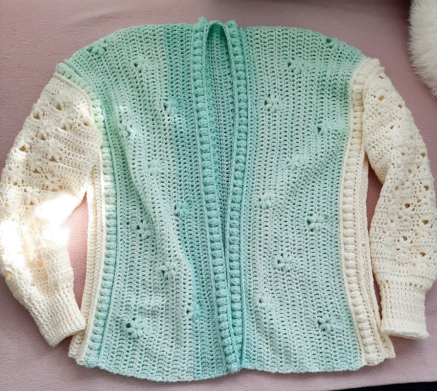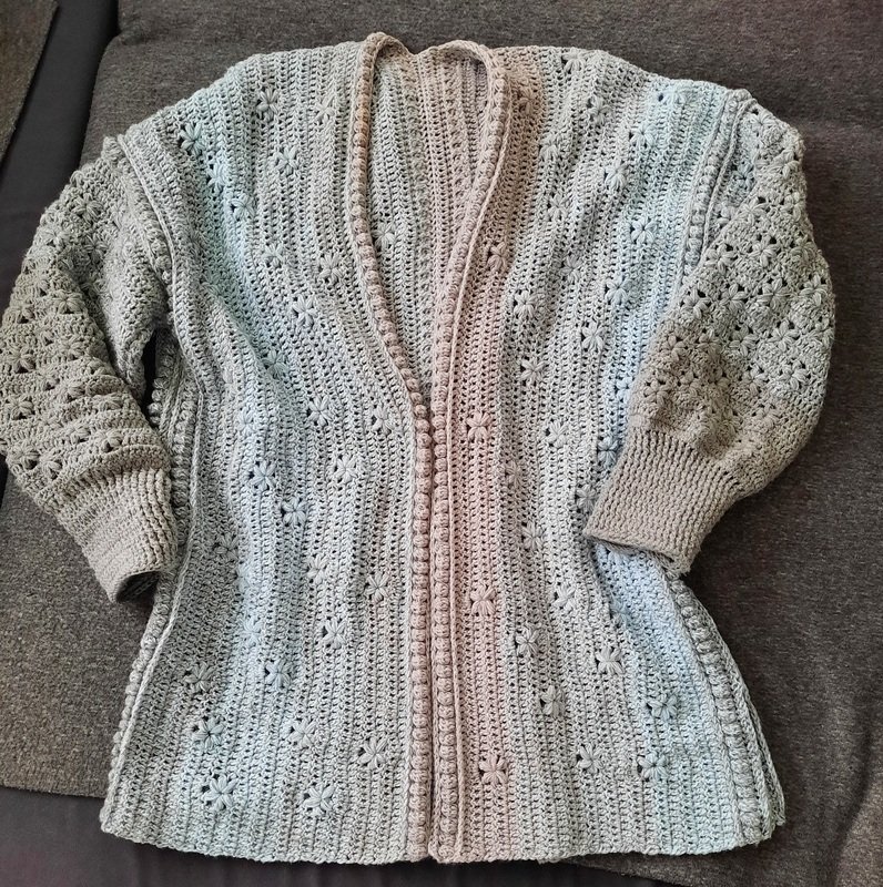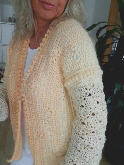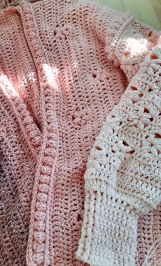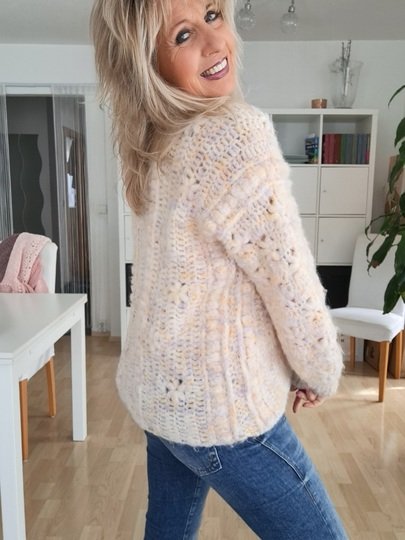 Die Jacke wird an einem Stück und quer gehäkelt, dadurch eignet sie sich perfekt