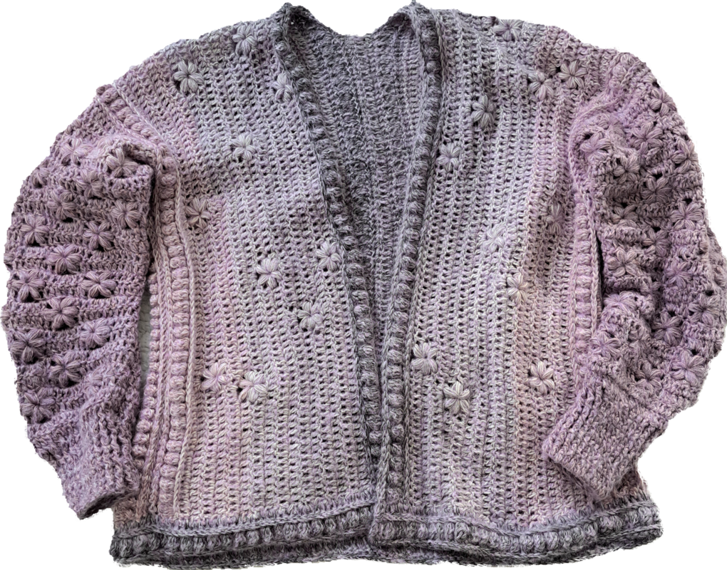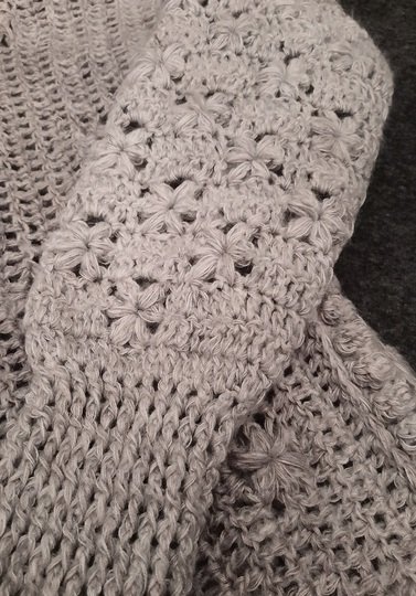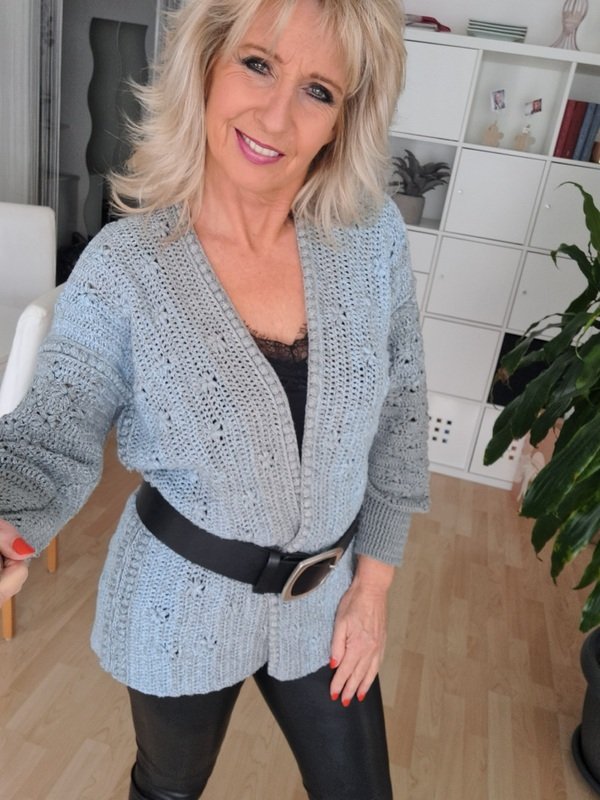 Das Garn für die graue Jacke ist eine Wunschwicklung mit Flauschfaden von Hexengarn, 4fädig verarbeitet.