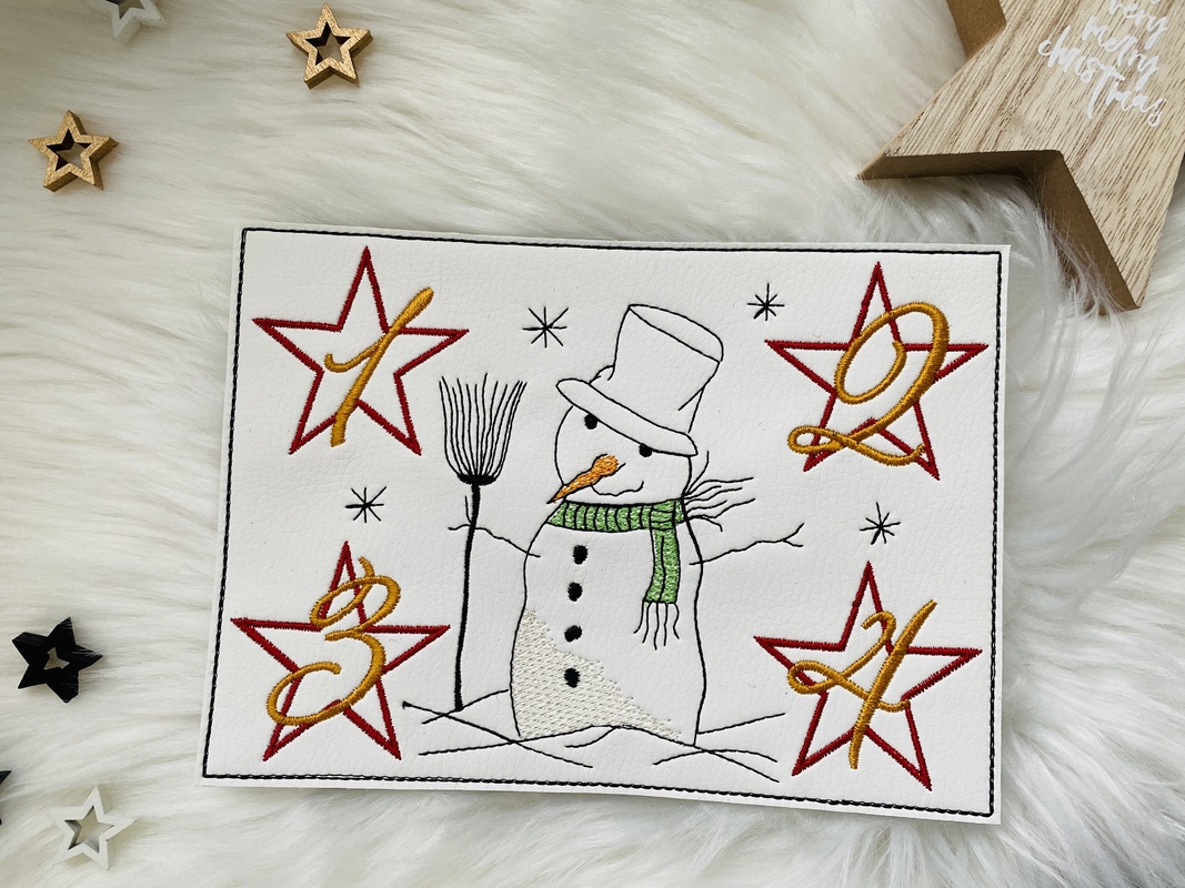 Eine Stickdatei für süße Untersetzer als Adventskränze to go. In den Ecken werden Sterne mit den Adventskranzzahlen 1 bis 4 gestickt, in der Mitte ergänzt mit einem Schneemann