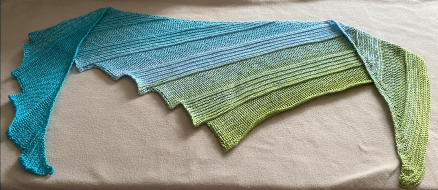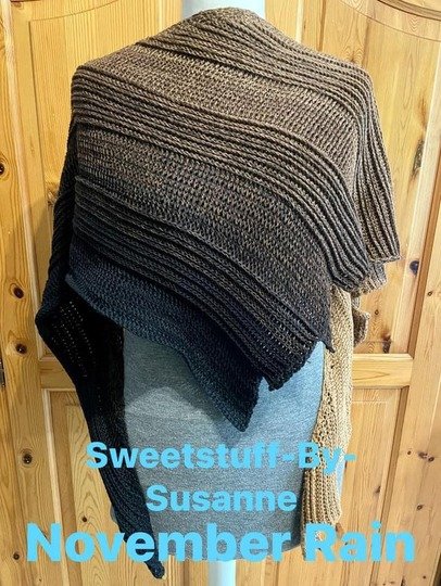 Meine November Rain erreichte mit einem vierfädigen Bobbel (1000 Meter) und Nadelstärke 4 eine Breite von 1,80 Metern und eine Tiefe von 60 Zentimetern.