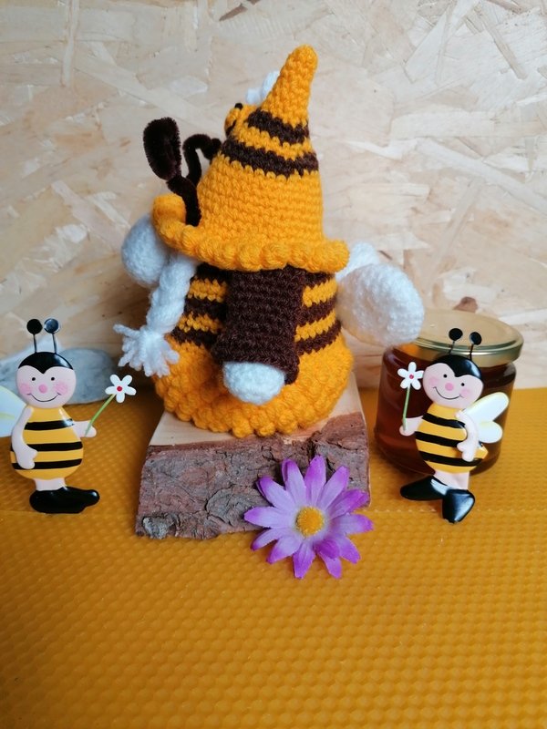 So, jetzt haben meine kleinen Honigbienchen auch noch einen kleinen Freund – wie süß! Ich liebe Bienen und habe auch eine kleine Imkerei. Bienen sind so wichtige Tierchen und was fehlte da noch? Ja genau, ein kleiner Bienen-Gnom. Hast du seinen kleinen Begleiter am Hut gesehen? Wenn du willst, kannst du ihm einen ganzen Bienenschwarm häkeln – er freut sich sicher! Hast du schon seinen dicken Bauch gesehen? Ich glaub, das kommt vom Honig schlecken – so fleißige Bienchen hat er…..