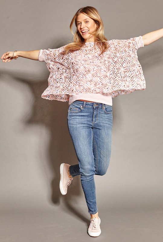 Unverzichtbar! Dieser lässige Pulli aus meliertem Baumwollgarn ist das Highlight für den Sommer. 56 Grannys werden nach Häkelschrift gearbeitet. Ab dem 2. Granny werden sie jeweils beim Häkeln an den Luftmaschenbögen der im Umkreis befindlichen Quadrate zusammengehäkelt. Dies spart im Nachhinein das Zusammennähen. Der Pullover wird in einem Stück gehäkelt, so entstehen die überschnittenen Schultern. Für den U-Boot-Ausschnitt werden die Grannys im Ausschnittbereich nicht miteinander verbunden. Damit der Pulli am Körper Halt findet, werden enge, schmale Ärmelbüdchen gestrickt. Das weiche Baumwollgarn von ONline häkelst du mit Nadelstärke 2,5. Den Pulli kannst du in der Größe 36-42 tragen.