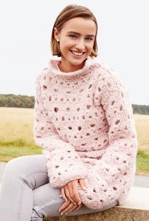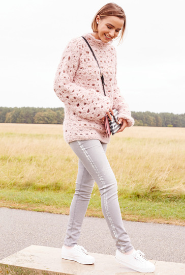 Diesen gemütlich weiten, langen Pulli magst du sicherlich nicht mehr ausziehen. Das weiche Garn umschmeichelt deinen Körper. Die langen Ärmeln, der kleine Stehkragen und das plastische Muschelmuster lassen ihn zu etwas ganz besonderem werden. Vorder- und Rückenteil sind ganz gerade gehäkelt und für den Halsausschnitt sind keine Abnahmen nötig. Für den Kragen werden die Maschen einfach aufgenommen und im Muster weitergehäkelt. Die Anleitung gilt für die Größen 36/38, 40/42 und 44/46.
