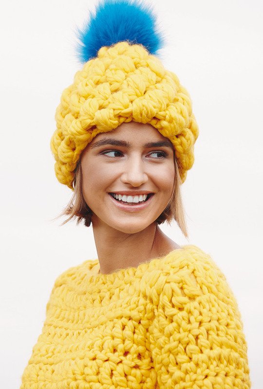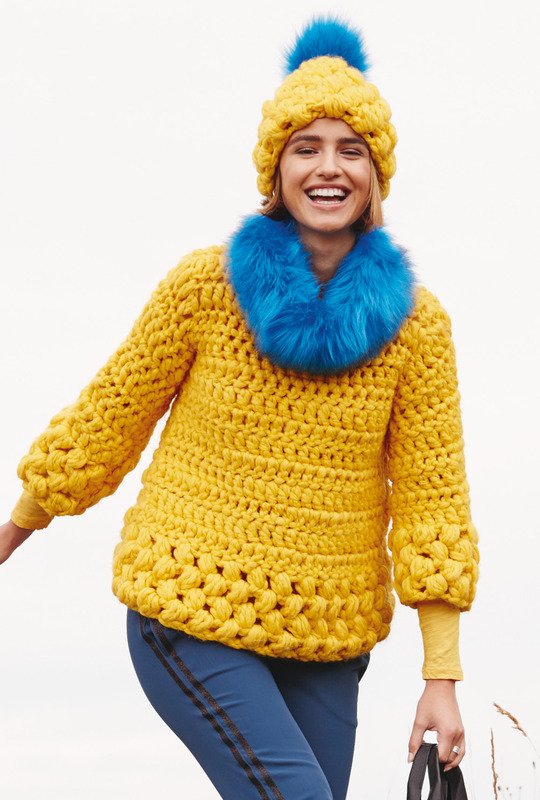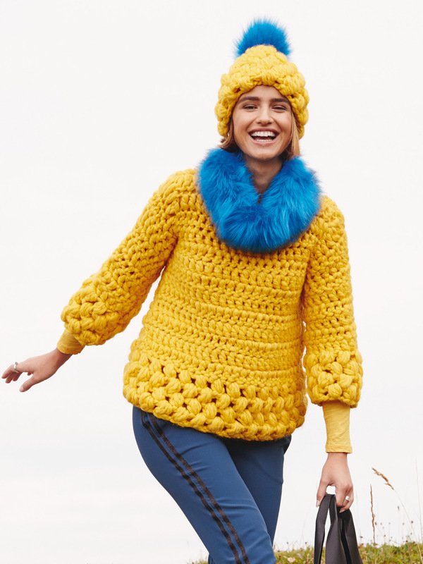 Gelb hat Power, wie dieser dicke, gehäkelte Pulli gut unter Beweis stellt. Er wird von oben nach unten im Stäbchenmuster gehäkelt. Zum Saum hin wird leicht zugenommen. Die üppige Weite ergibt sich dann durch die andere Maschenprobe des Büschel-Maschen-Musters. Damit die Mütze guten Halt hat und nicht zu viel Luft durchlässt, wird sie mit einer dünneren Nadel gehäkelt. Das Schurwoll-Mischgarn ist von Lana Grossa. Es wird mit Nadelstärke Nr 9 und Nr 10 gehäkelt. Die Anleitung gilt für die Größen 36, 38, 40, 42, 44 und 46.