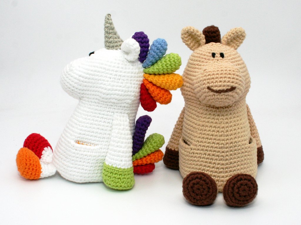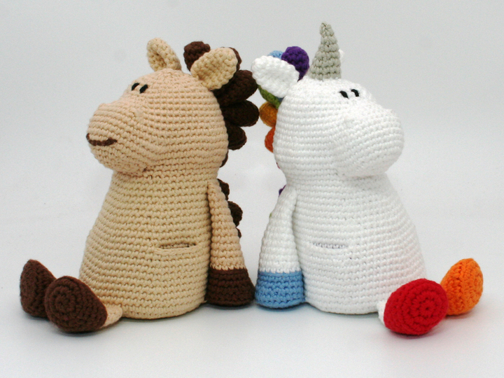 Mit 3.0 mm Nadel und DK Garn wie z.B. Puppets Lyric 8/8 oder Sport Garn doppelt genommen wie z.B. Catona oder Catania Originals wird das Pferd/Einhorn 15 cm breit & 17 cm groß (ohne Horn).