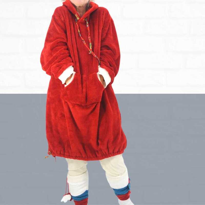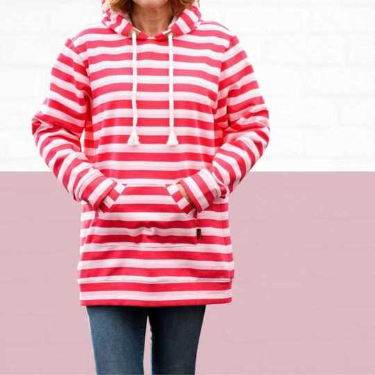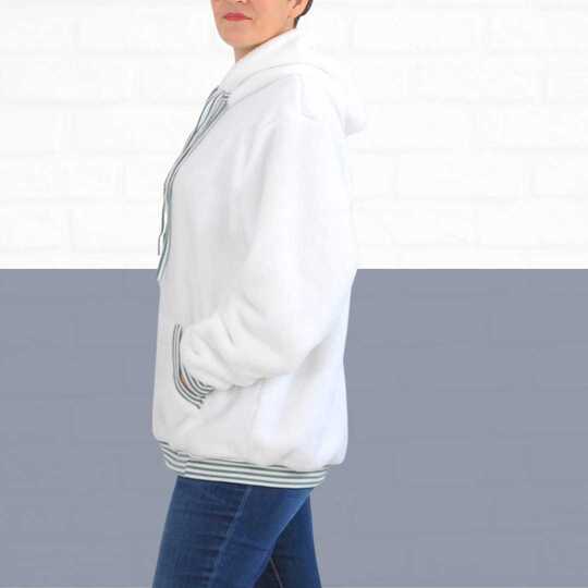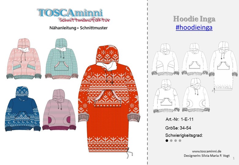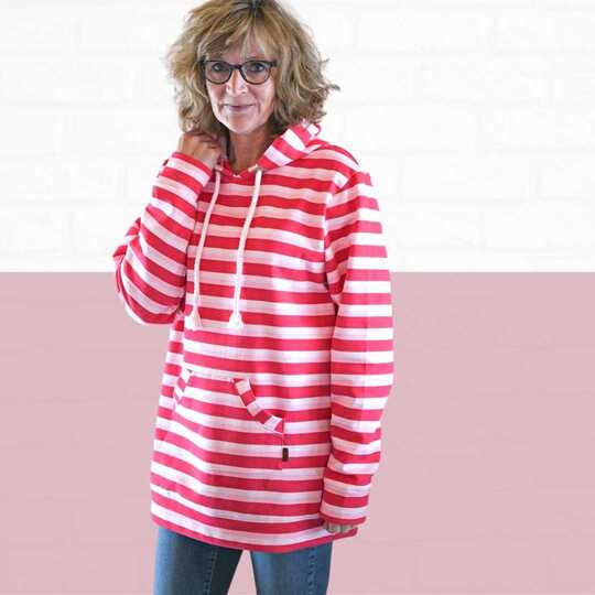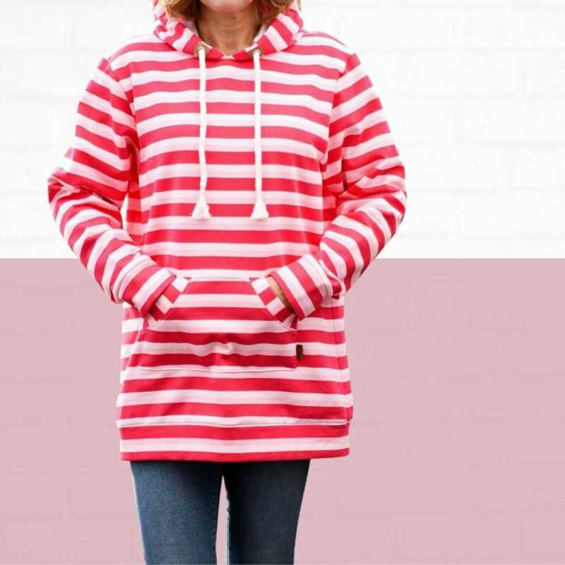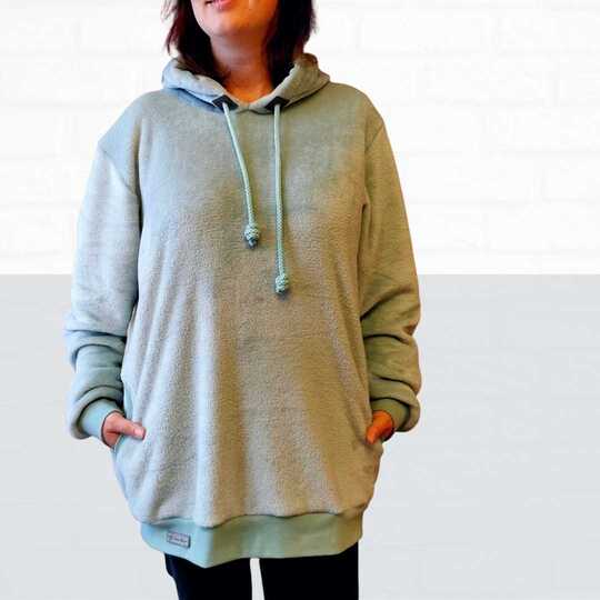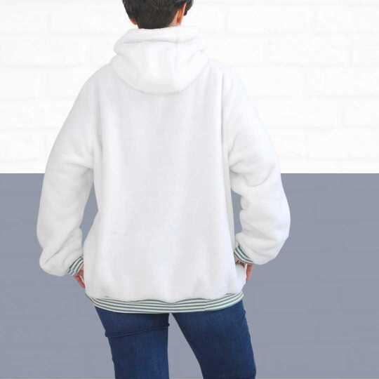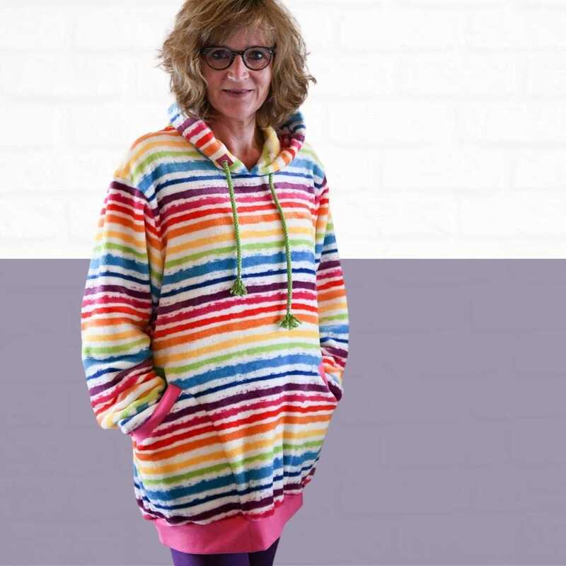 Mit dem Schnittmuster Inga nähst Du Dir einen coolen Oversize Hoodie für Tage, die besonders kuschelig sein müssen. Der Hoodie ist extra weit geschnitten und wird aus Fleece oder Plüsch genäht. Die Ärmel sind überlang, so dass auch die Hände garantiert warm bleiben. Wer mag, kann den Hoodie auch als „Kuschel-Kleid“ nähen, so hat man das richtige „Pyjama“-Outift zum Lümmeln auf der Couch.