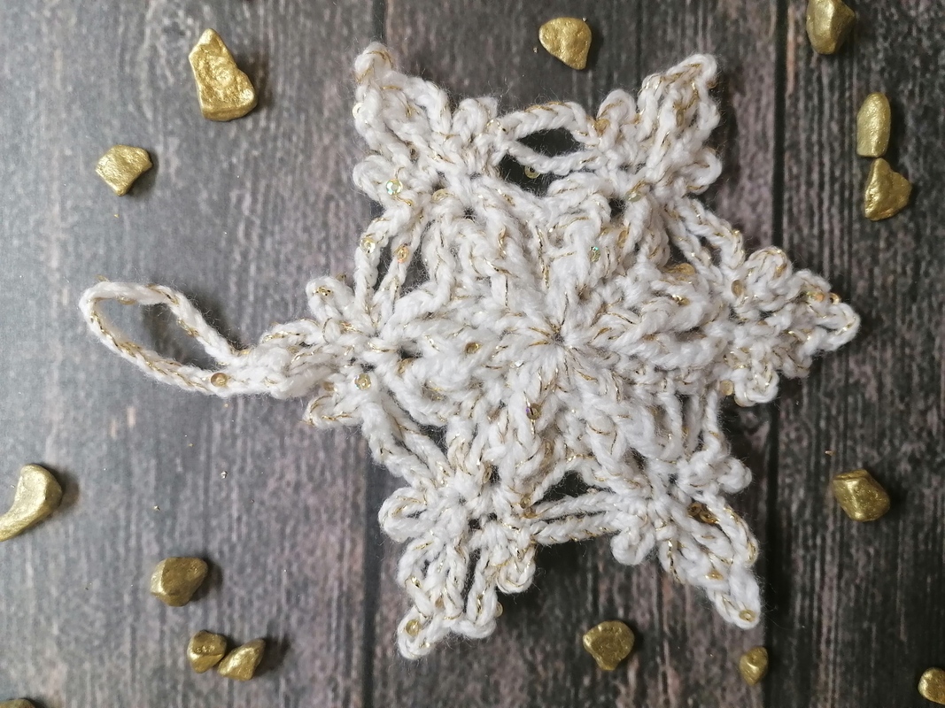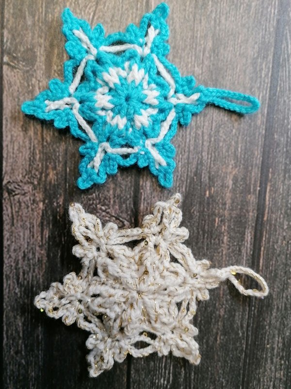 Mit der von mir gewählten Wolle wird der Stern etwa 12 cm groß. Ich häkle eher kompakt, daher kann es durchaus passieren, dass dein Stern etwas größer oder kleiner wird. Ich bin mir auch sicher, dass der Stern mit einem schönen Filetgarn zwar klein, aber sehr edel wird – probier es einfach aus.