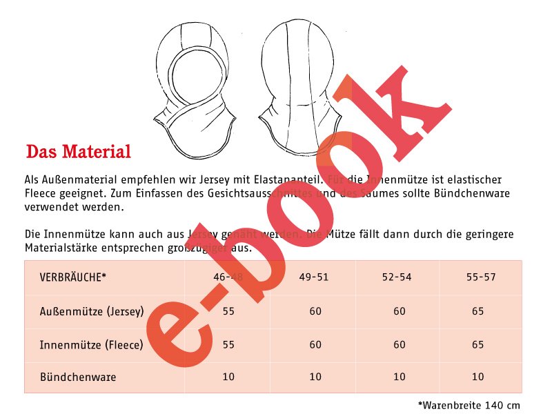 Als Außenmaterial empfehlen wir Jersey mit Elastananteil. Für die Innenmütze ist elastischer Fleece geeignet. Zum Einfassen des Gesichtsausschnittes und des Saumes sollte Bündchenware verwendet werden. Die Innenmütze kann auch aus Jersey genäht werden. Die Mütze fällt dann durch die geringere Materialstärke entsprechen größer aus.