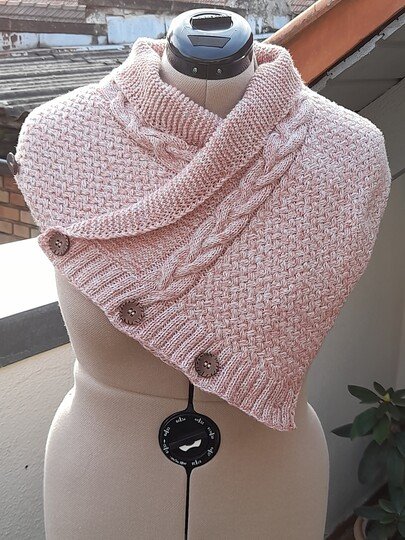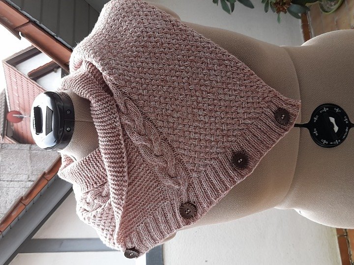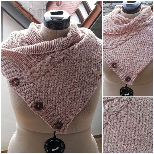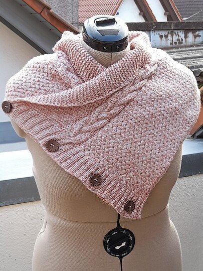 Mit den Knöpfen kann er zu und aufgeknöpft werden, was man aber eigentlich nicht braucht, da Du ihn wie einen Loop einfach über den Kopf ziehen kannst, aber Du kannst ihn auch mal mit einen Knopf versetzt tragen. Die Knöpfe sind ein zusätzlicher Blickfang und runden das Gesamtbild ab. Auf der anderen Seite habe ich einen verdeckten Druckknopf befestigt, damit auch da nichts verrutschen kann.