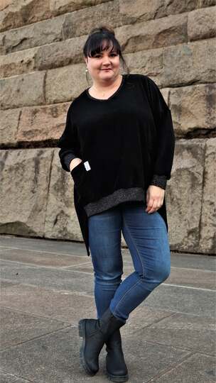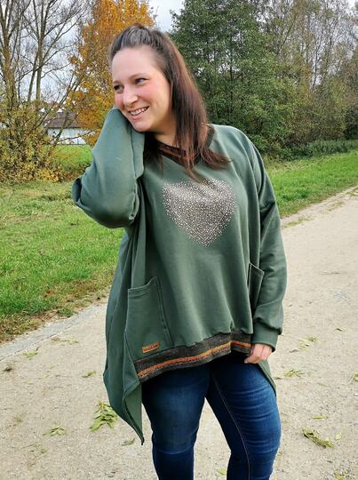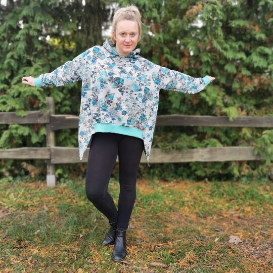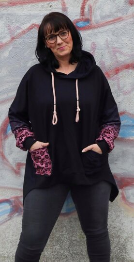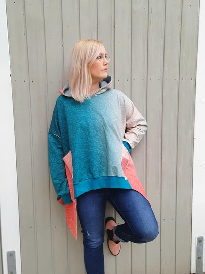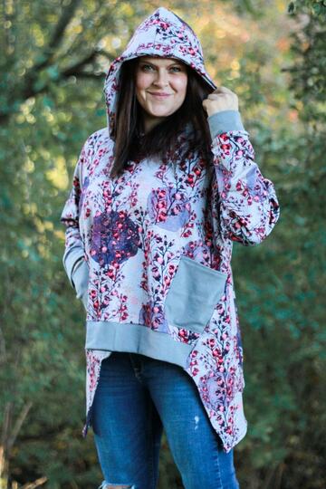Der Hoodie hat eine trendige Oversize-Form mit leicht asymmetrischem Saum, der für einen besonderen Hingucker sorgt. Dank der verschiedenen Optionen kannst du zwischen einem klassischen V-Ausschnitt oder einer kuscheligen Kapuze wählen. Praktische aufgesetzte Taschen verleihen dem Hoodie zusätzlichen Komfort und Funktionalität. Das Schnittmuster eignet sich hervorragend für Stoffe wie French Terry, Sweat oder Walk, sodass du es für jede Jahreszeit anpassen kannst.
