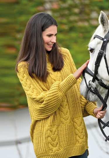 Patentmuster und markante Zopfstreifen machen bei dem legeren Pullover mit tief eingesetzten Raglanärmeln gemeinsame Sache. Die High-Low Form wird durch Seitenschlitze akzentuiert.