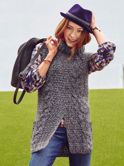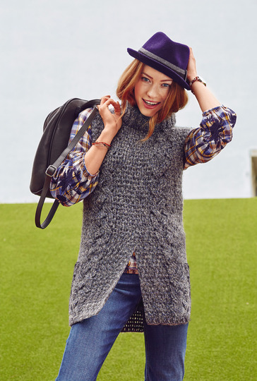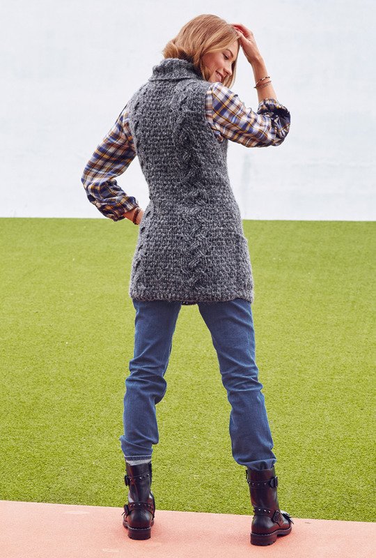 Genau das Richtige! Mit diesem gehäkelten Pullunder bist du perfekt für Outdoor-Aktivitäten angezogen. Er reicht weit über die Hüfte, hat vorne einen dekorativen Schlitz, das weiche Garn mit einem Anteil von Alpakawolle hält warm, wie auch der im Rippenmuster gestrickte Rollkragen. Die über jeweils 6 M gearbeiteten Zöpfe bestehen aus Dreifach-Reliefstäben. Etwas kniffelig, aber wenn du erst eine Maschenprobe machst, wirst du sehen, sie sind kein Hexenwerk. Das Garn ist von Junghans Wollversand und wird mit Nadelstärke Nr 5 gearbeitet. Die Anleitung beschreibt die Größen 36, 38, 40, 42, 44 und 46.