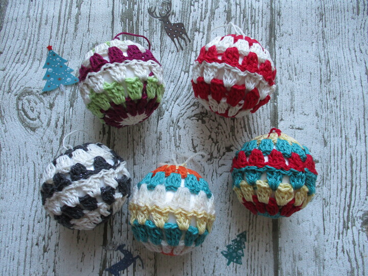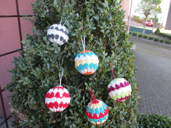 Einfache Bild an Bild Anleitung zum nach häkeln dieser bunten Christbaumkugeln.
