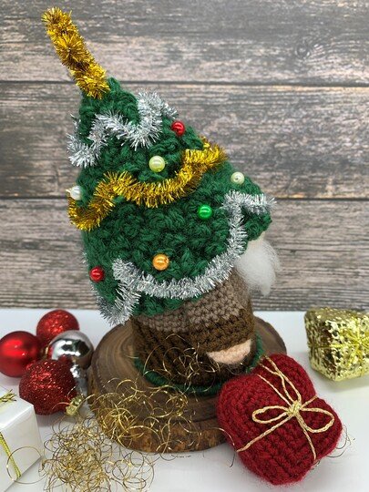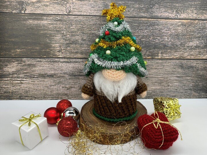 Dieser kleine Gnom hat einen festlichen Christbaum als Hut, er freut sich schon sehr über all die Geschenke, die er hoffentlich bekommt!