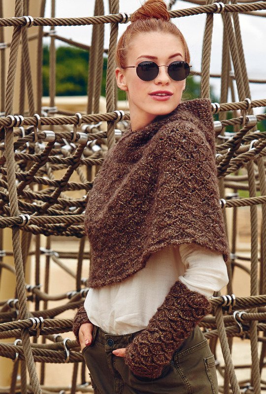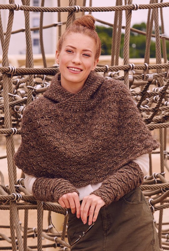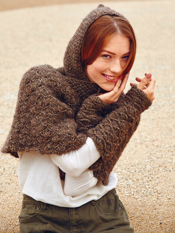 So schön können gehäkelte Accessoires sein! Dieses Schultercape ist nicht nur praktisch, sondern auch sehr wärmend. Es wird am Saum begonnen und im Muschelmuster gehäkelt. Für die Formgebung muss dann innerhalb des Musters abgenommen werden. Aber das ist genau beschrieben. Die Kapuze wird direkt nach Beendigung des Caps auf die obere Kante im Halbstäbchenmuster gearbeitet. Für den großzügigen Übertritt in der vorderen Mitte wird am Anfang in die Maschen nur ein das vordere Maschenglied eingestochen und am Ende der Reihe in die gleiche Masche in das hintere Maschenglied. Abgerundet wird das Ganze mit den langen Handstulpen. Das weiche Alpaca-Mischgarn in von Lana Grossa. Du häkelst mit den Nadelstärken Nr 5, 5,5 und 6.