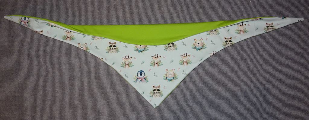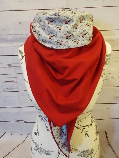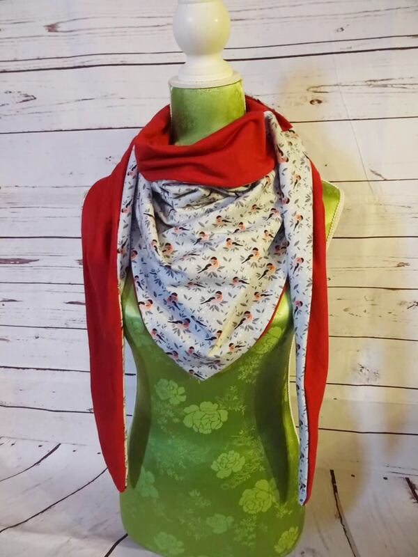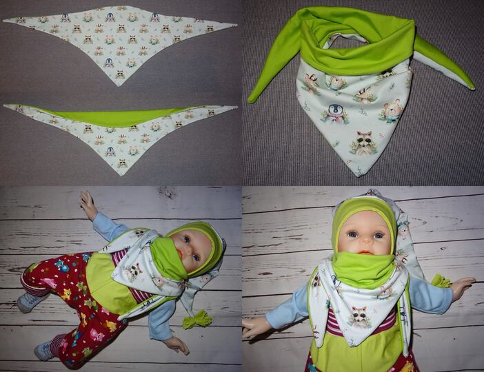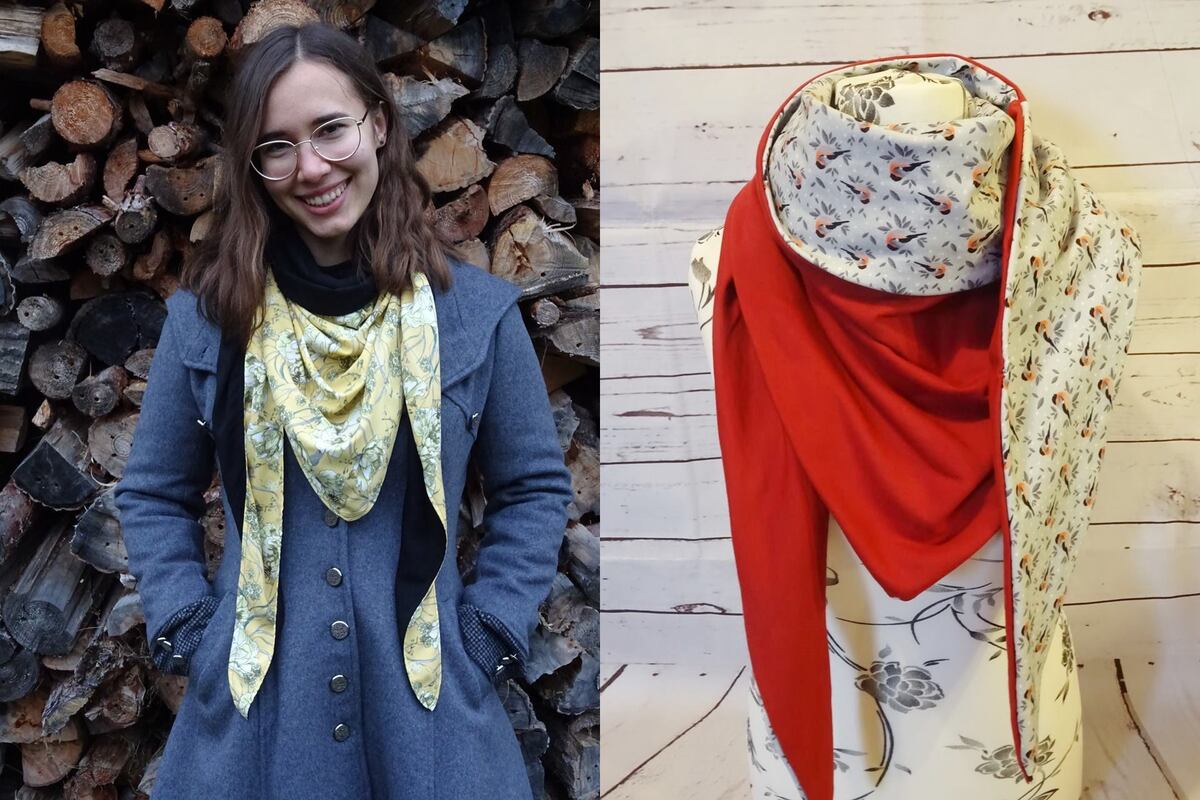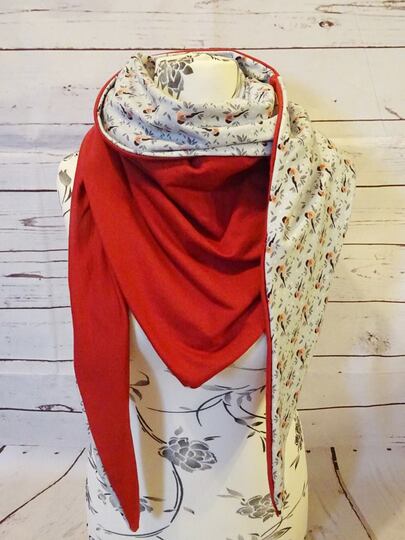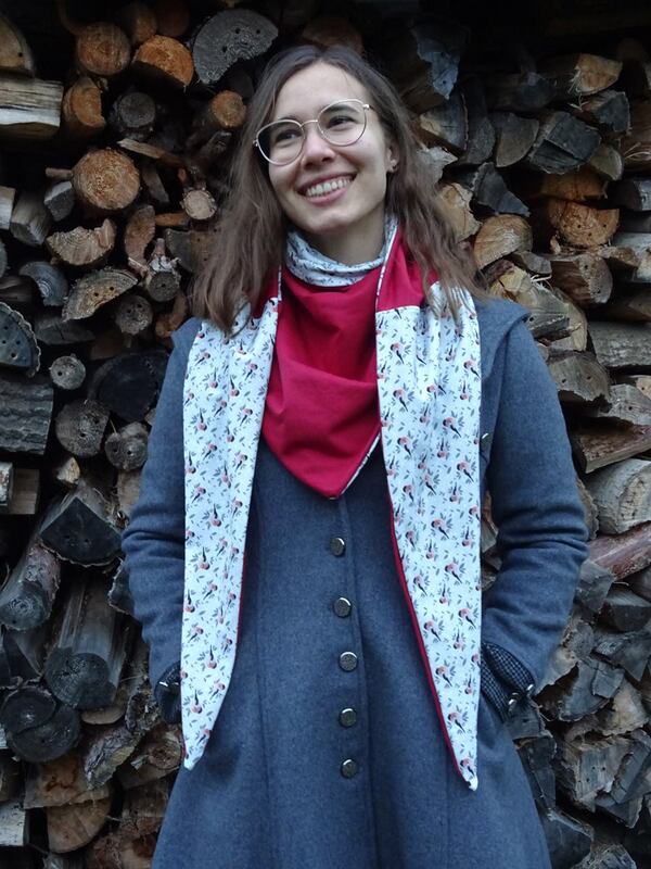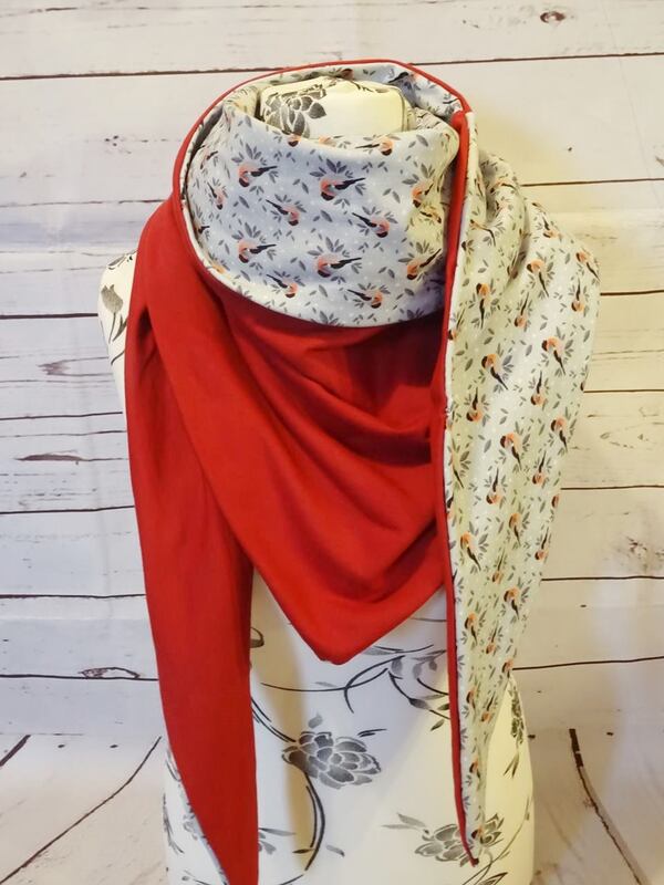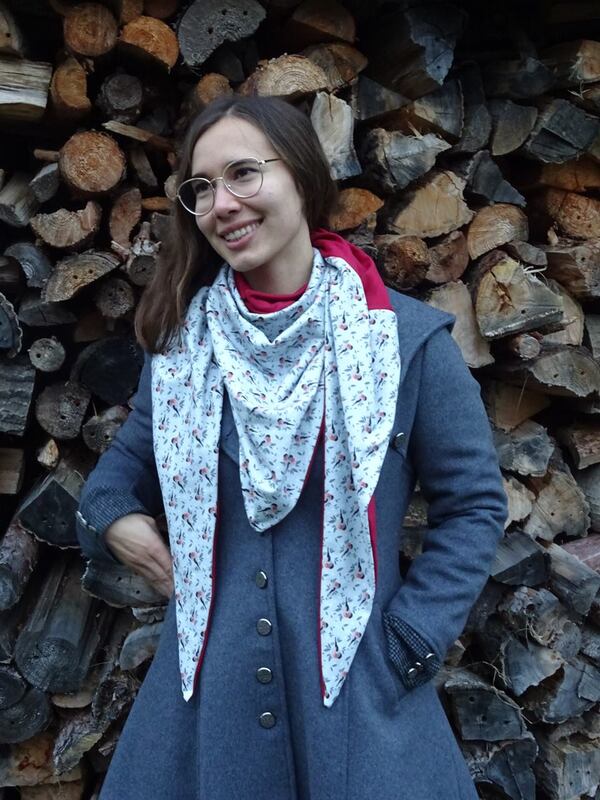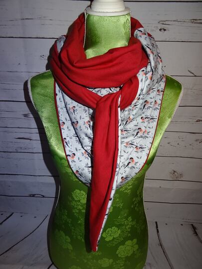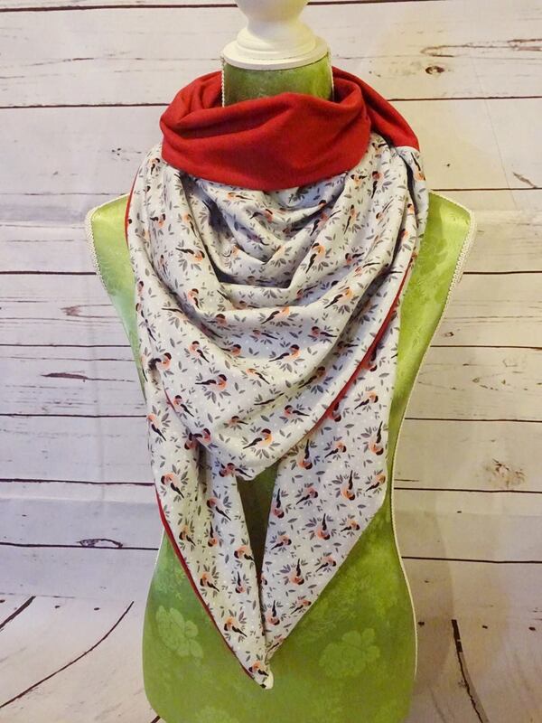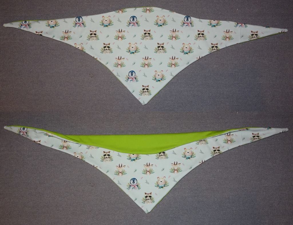 Es ist vorn hoch geschnitten, so dass vorn am Hals etwas mehr Stoff ist und von der Stoff von der Rückseite einen schönen Farbkontrast erzeugt.