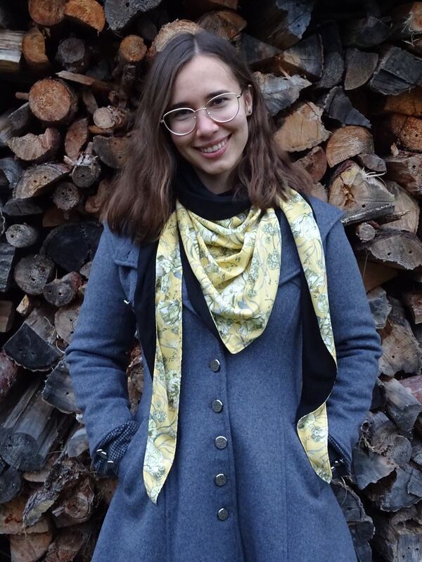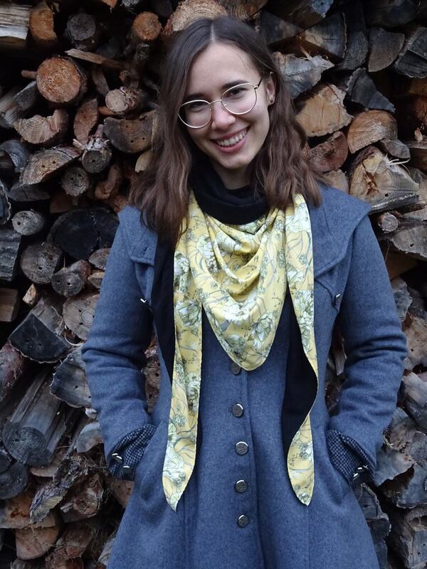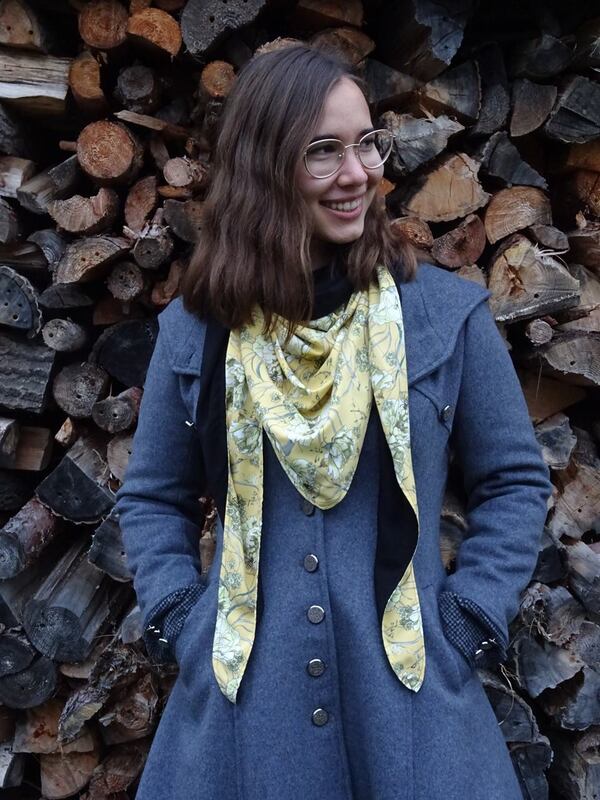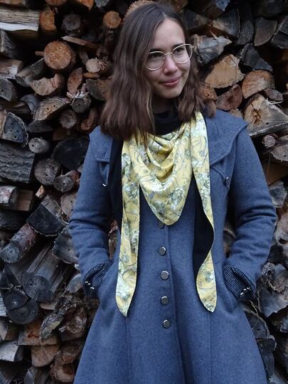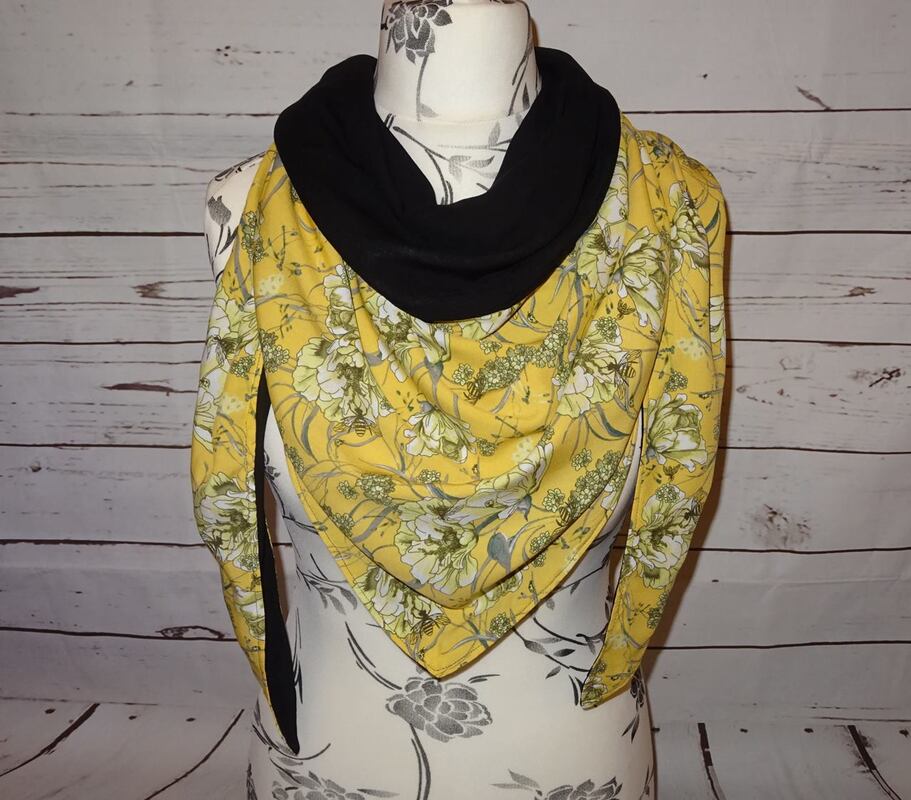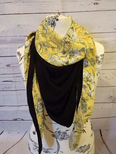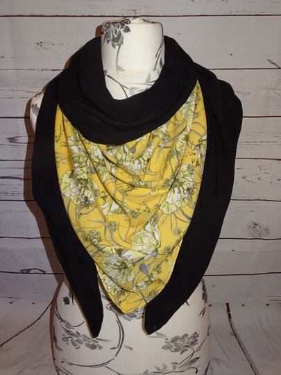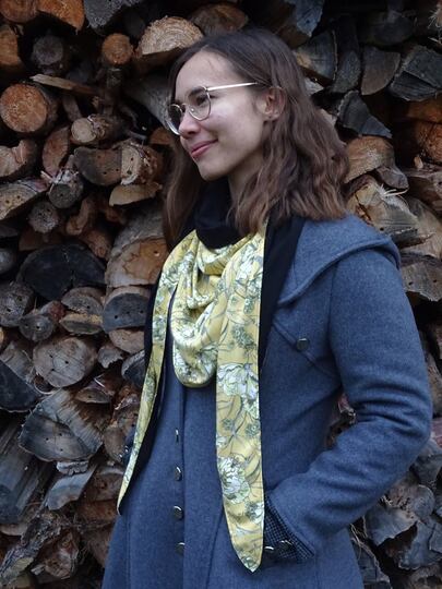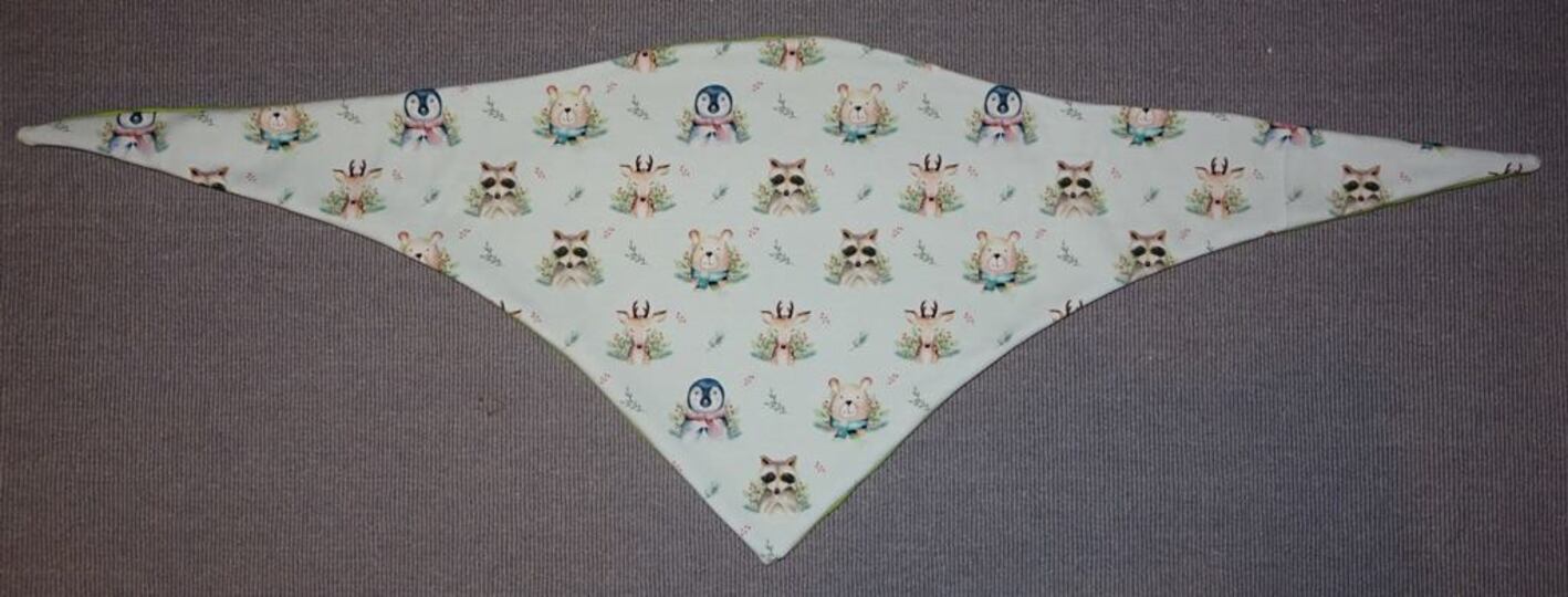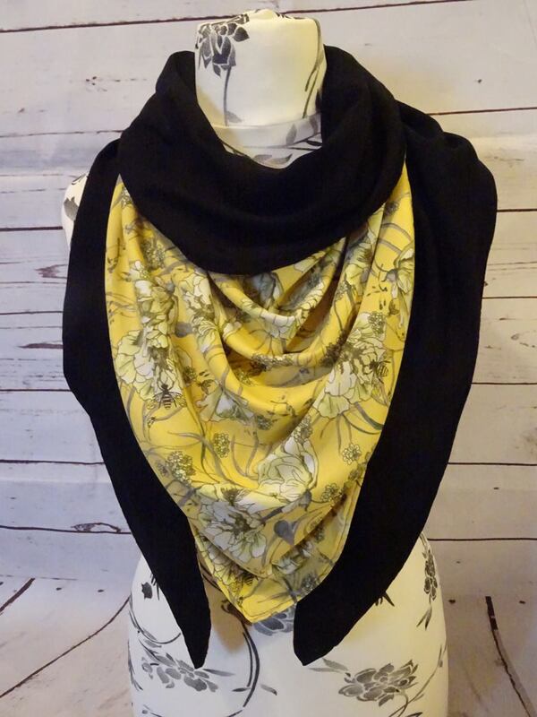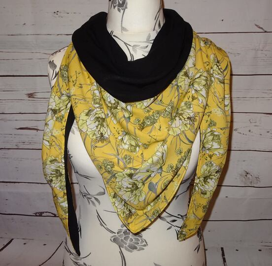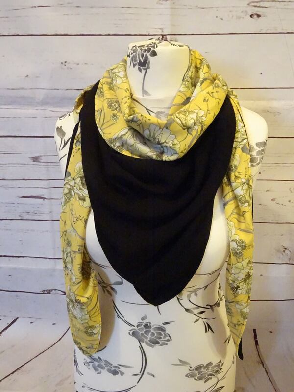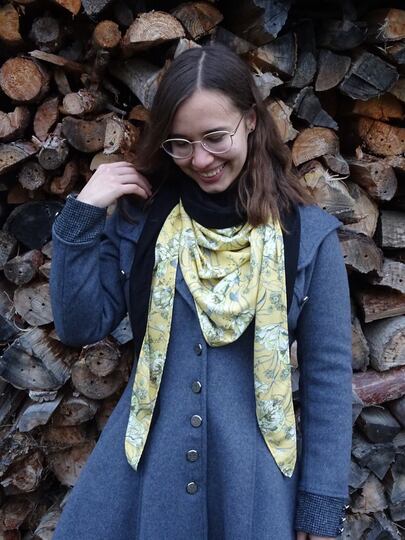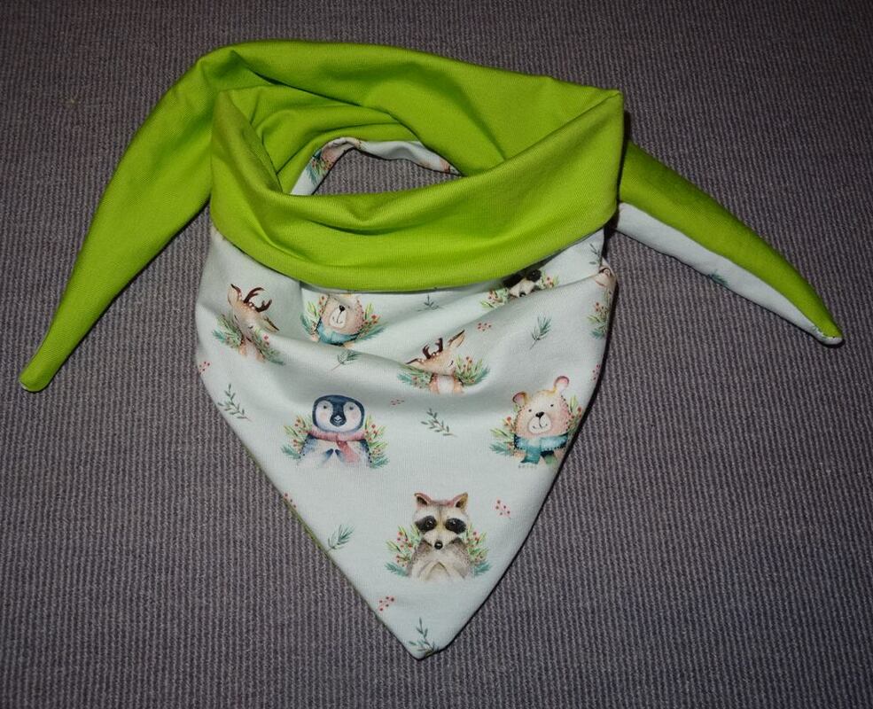 Es ist vorn hoch geschnitten, so dass vorn am Hals etwas mehr Stoff ist und von der Stoff von der Rückseite einen schönen Farbkontrast erzeugt.