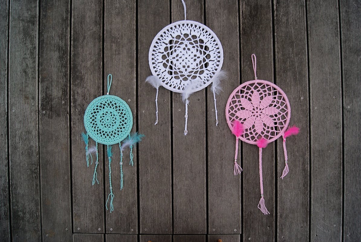 Häkle dir deinen dekorativen Traumfänger in verschiedenen Größen und Farben und mache dein Schlafzimmer/Kinderzimmer noch gemütlicher. Auch als Geschenk zauberst du damit jedem ein Lächeln ins Gesicht. Beim Verzieren kannst du deiner Kreativität freien lauf lassen.
