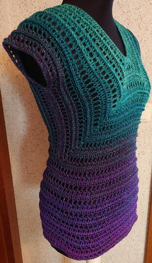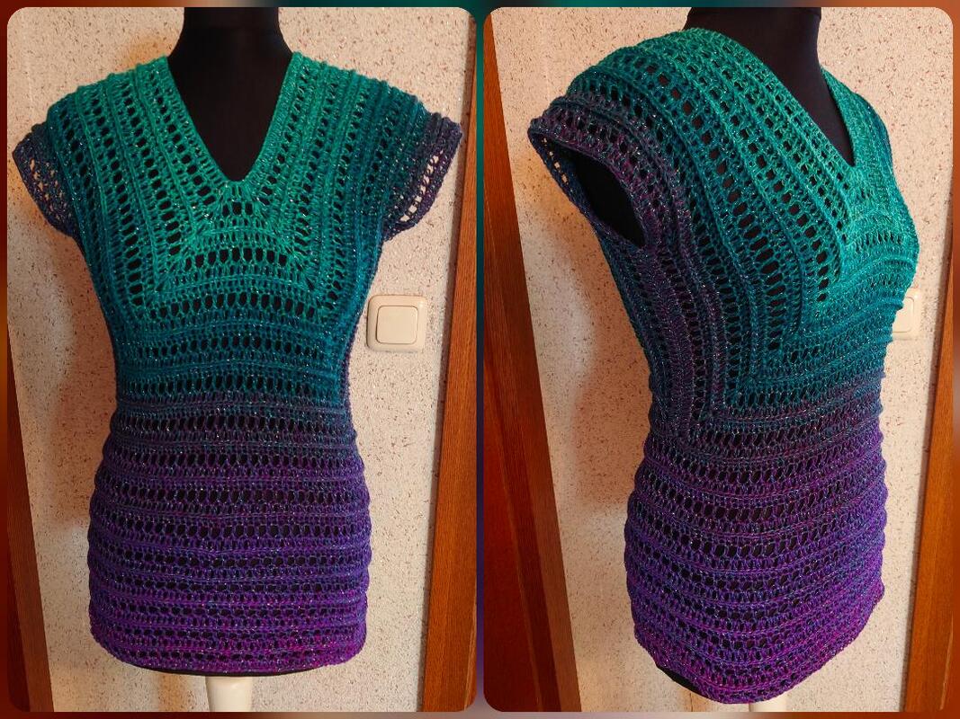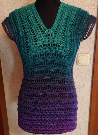 Die Tunika Carola wird in Runden an einem Stück gehäkelt. Dadurch ist sie hervorragend für Farbverlaufsgarn geeignet. Außerdem lässt es sich gut "nebenbei" häkeln, da das Muster schnell im Kopf bleibt.