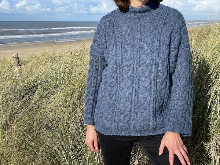 Es ist ein Oversize Pullover mit weiten Ärmeln und verschiedenen Zopfmustern. Der Pullover VIOLA wird lässig getragen mit einer Mehrweite von ca. 10 – 12 cm.