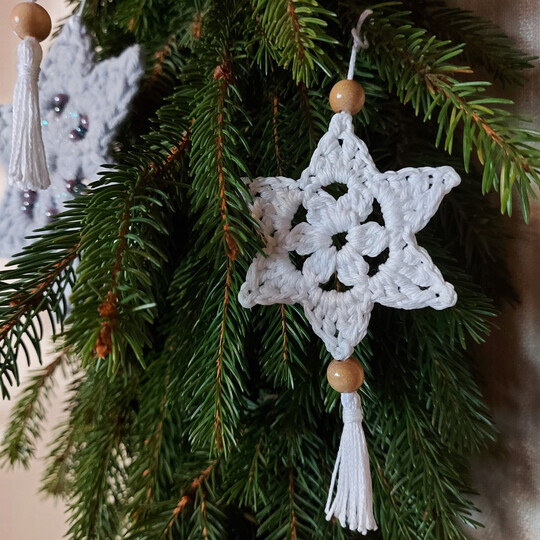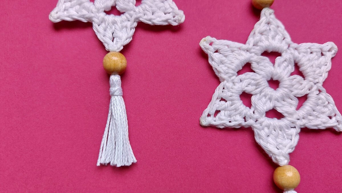 Dieser Weihnachtsschmuck oder Geschenkanhänger im Boho-Stil ist in zwei Runden gehäkelt.