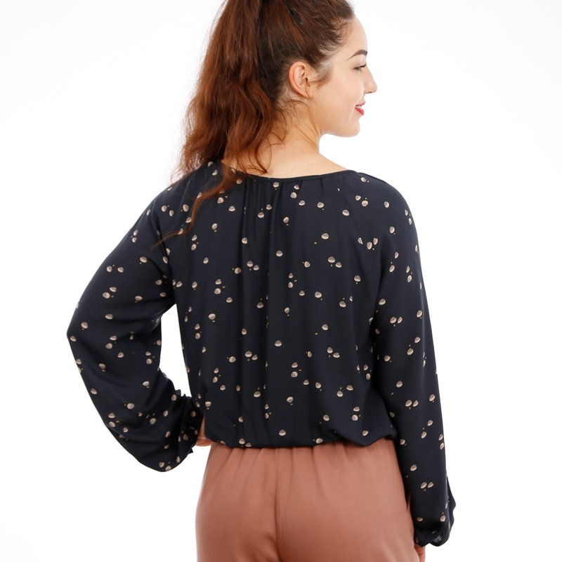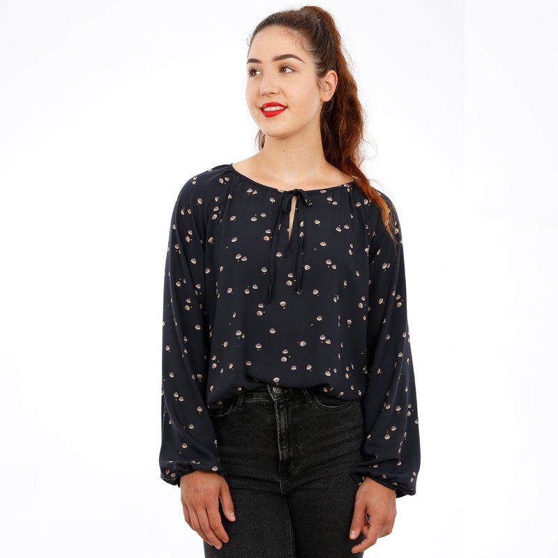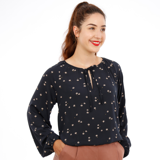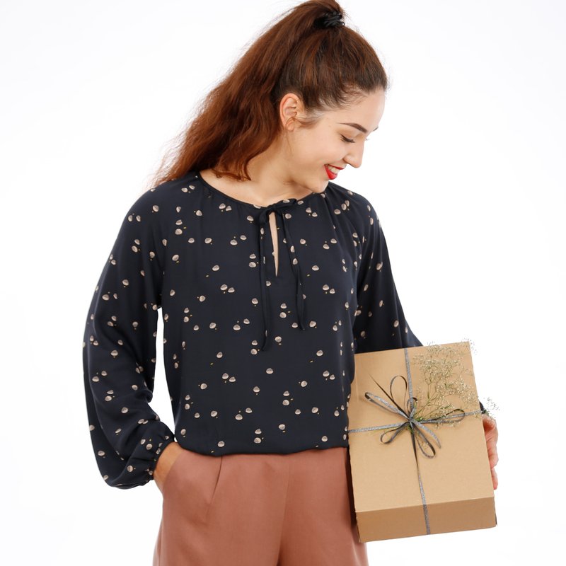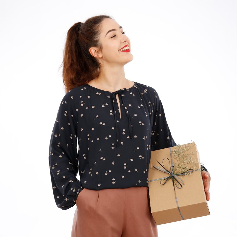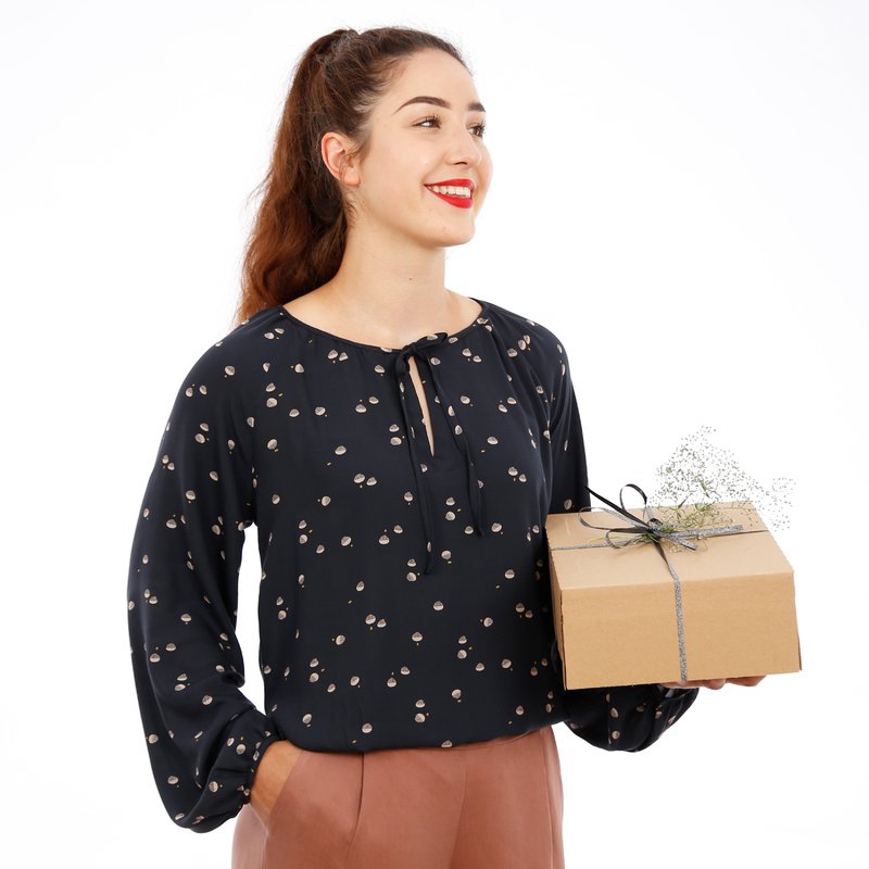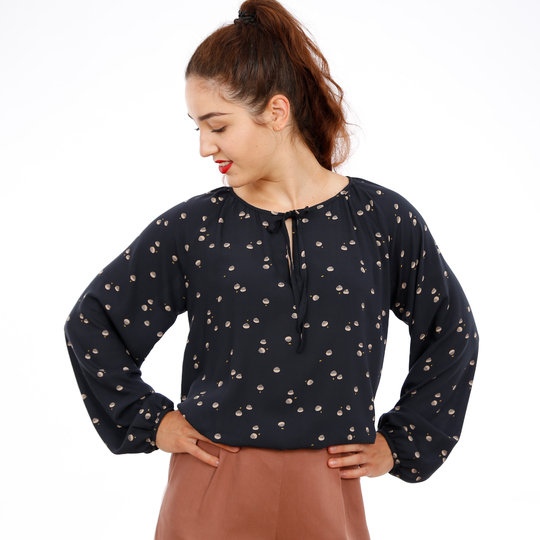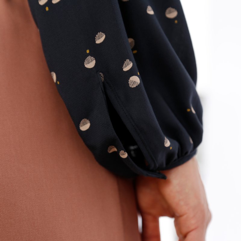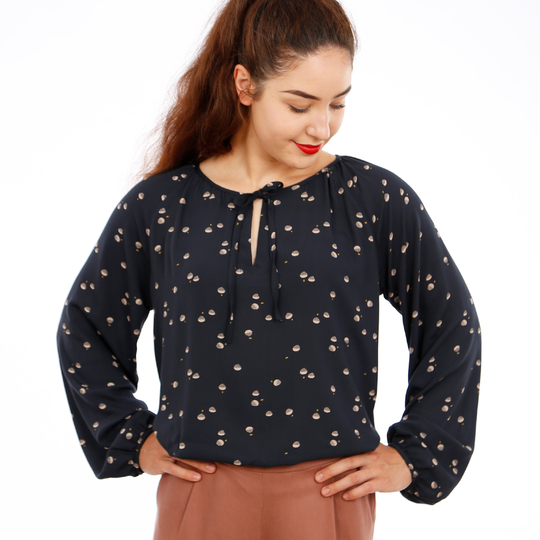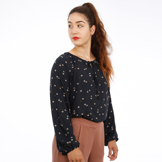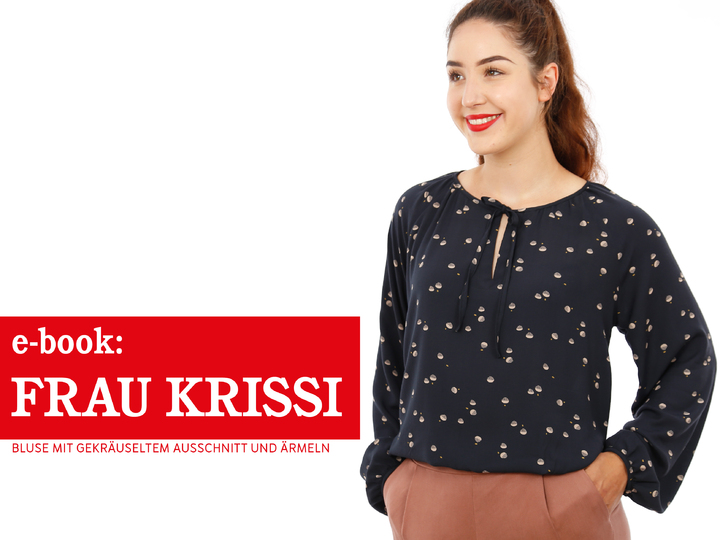 FRAU KRISSI ist eine Bluse für Liebhaberinnen von feinen Details. Grundlage bildet ein weiter Raglanschnitt, der an den Ärmelsäumen und am Halsausschnitt eingekräuselt und durch ein Bändchen eingefasst wird. Gleich drei Schlitze zieren FRAU KRISSI und erleichtern auf elegante Weise das An- und Ausziehen, einer in der vorderen Mitte des Halsausschnitts und einer am jeweiligen Ärmelsaum. Ein Bindebänchen und kleine Druckknöpfe ergänzen dieses praktische Detail.