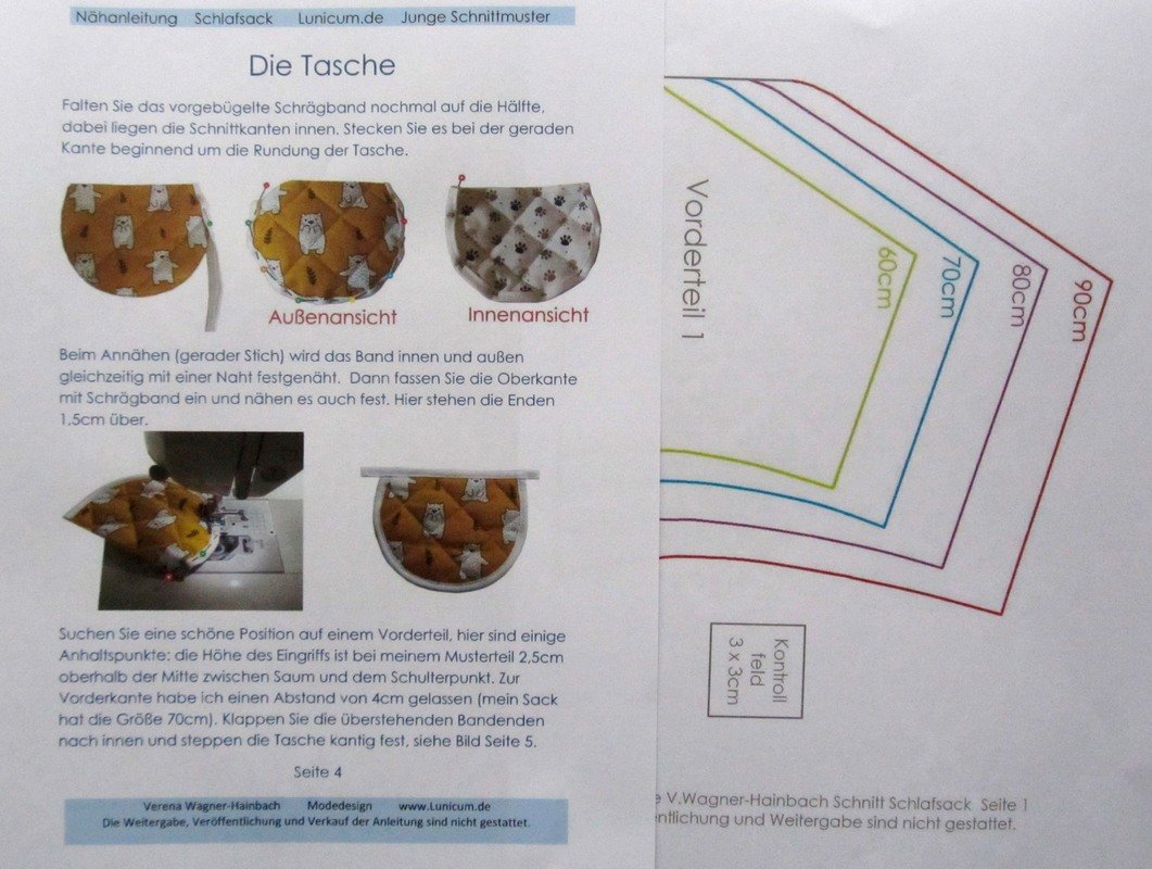 Die Verarbeitung des Modells ist einfach und für Ungeübte gut geeignet, es sind keine komplizierten Arbeiten dabei. Alle Arbeitsschritte sind in der Anleitung ausführlich beschrieben und mit vielen Fotos und Skizzen dargestellt, so können Sie den Schlafsack step by step einfach nachnähen.