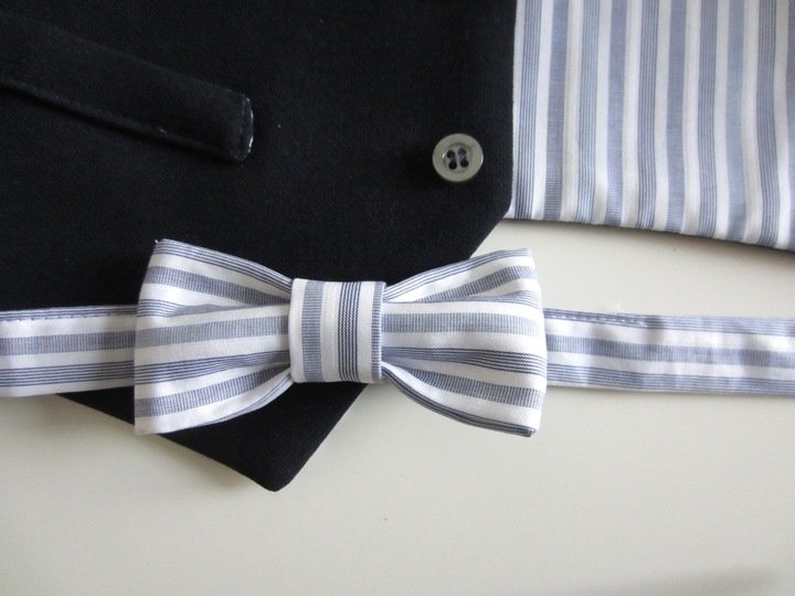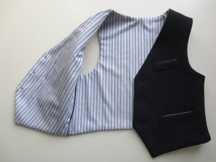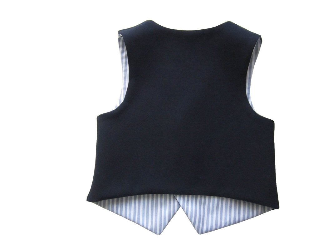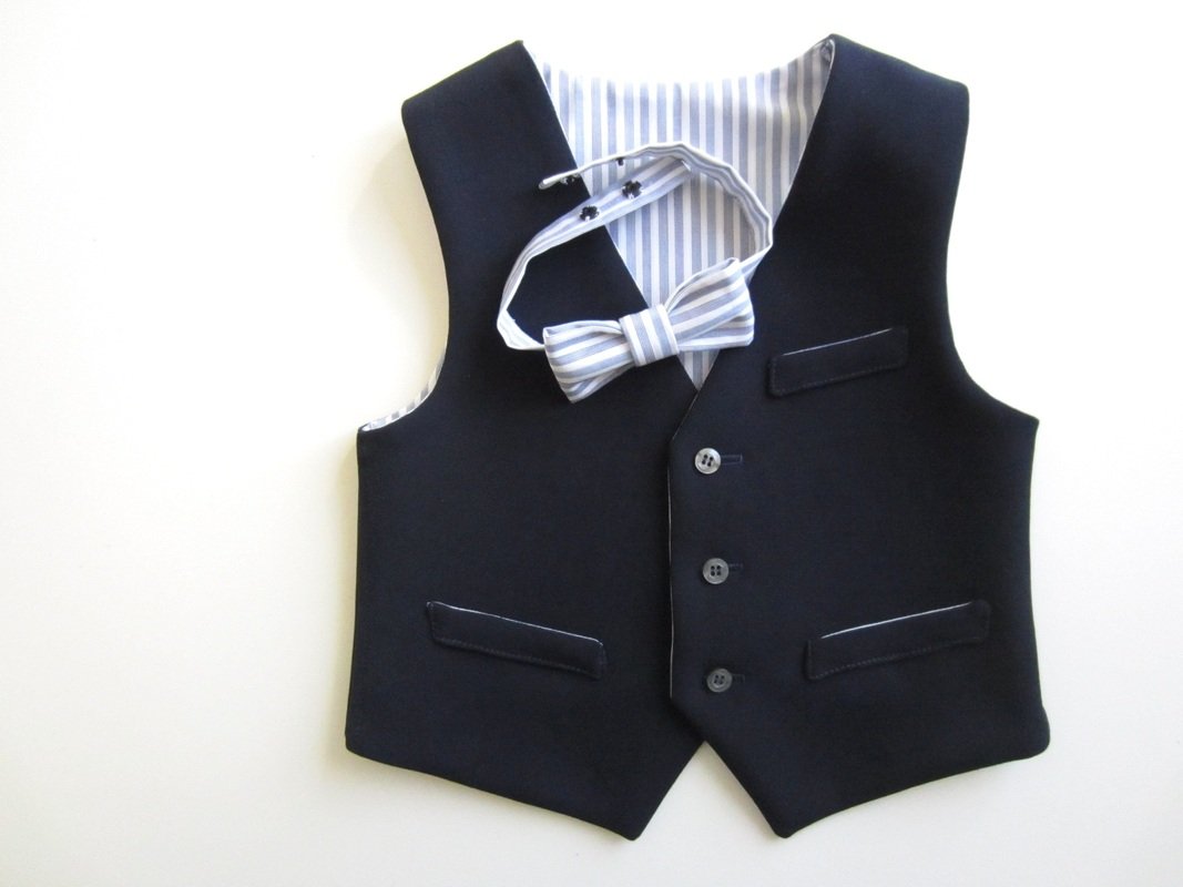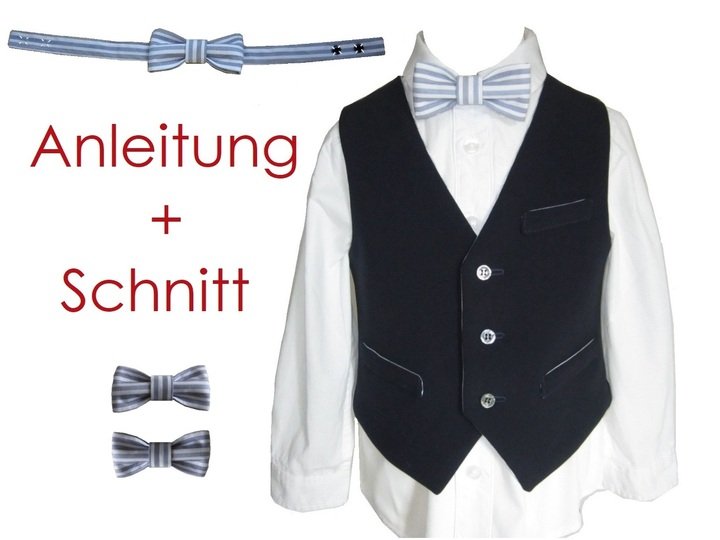 Schnittmuster und Arbeitsanleitung für eine Weste mit passender Fliege, ein cooles Outfit für kleine und größere Hipster. Die Weste wird gefüttert verarbeitet, als Futterstoff suchen Sie ein schönes Krawattenmuster oder einen Streifenstoff. Aus diesem Futterstoff können Sie dann auch die Fliege nähen, so dass Sie eine perfekt passende Kombination für Ihren Jungen haben. Die Weste hat außen blinde Taschenleisten aufgenäht, dadurch haben Sie die schöne Herren-Optik, aber nicht so viel Arbeit. Sie ist innen komplett mit dem Futter bis zur Kante gedoppelt, bei kontrastfarbenem Futter sieht man also ein bisschen an der Kante und an den Taschenleisten, die auch mit Futter gedoppelt werden. Das Gilet können Sie aus waschbarer Wolle, Mischgewebe, Baumwolle oder Kord nähen, als Futter ist Baumwolle oder ein hochwertiges Viskosefutter geeignet.