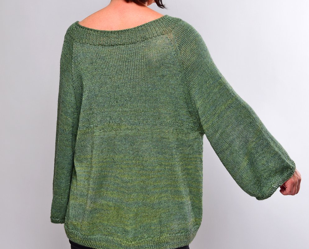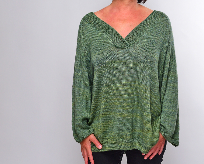 Taya ist ein sehr gemütlicher Oversized-Pullover mit V-Ausschnitt. Gestrickt wird er von unten nach oben in einem Stück. Die leichten Rundungen im unteren Rücken- und Vorderteil werden mit verkürzten Reihen gestrickt. Die Vorgehensweise wird in der Anleitung detailliert erklärt, aber es wird auch ein Link zu einem Video angegeben, das die Technik sehr gut beschreibt.