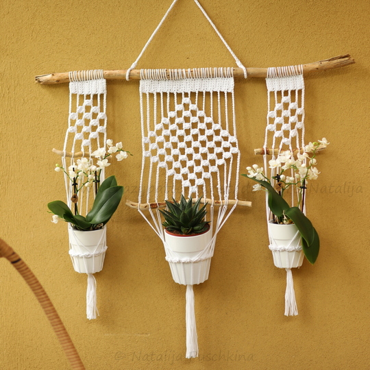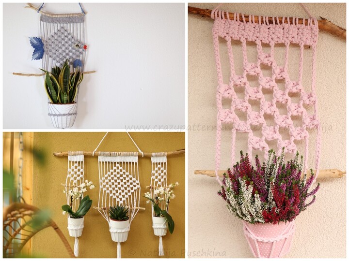 Häkelanleitung für Pflanzenhalterungen in Makramee-Optik in drei verschiedenen Designs.