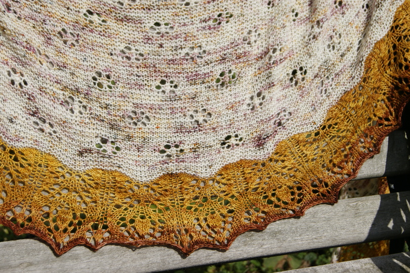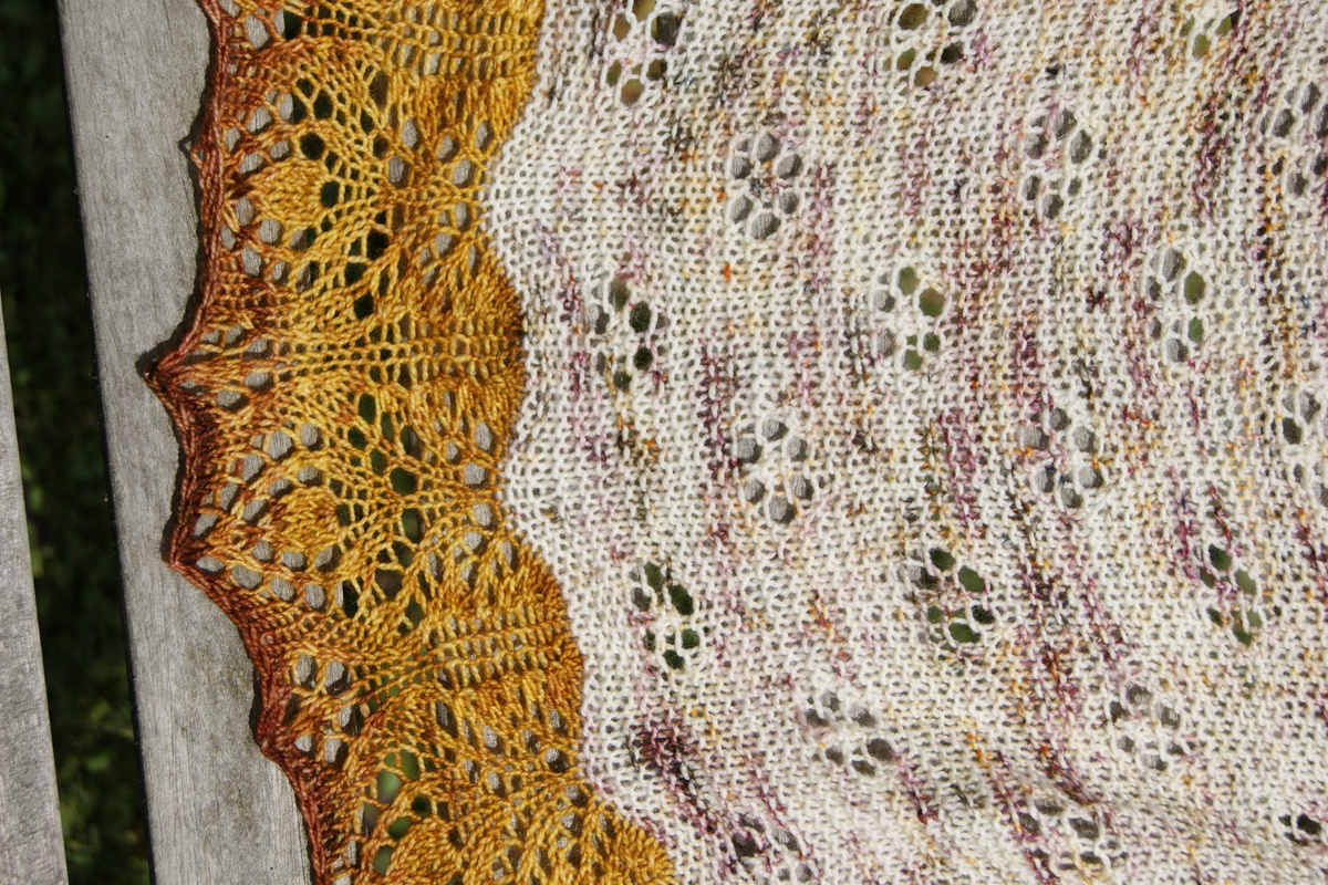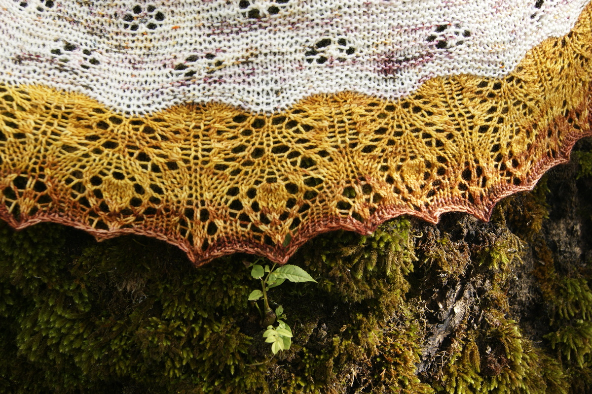 Das Tuch wird in Crescent Form mit zwei kontrastierenden, aber zugleich harmonierenden Farben gestrickt. Ich empfehle, für den kraus rechts Teil ein meliertes Garn zu benutzen und das Wellenmuster einfarbig zu arbeiten.