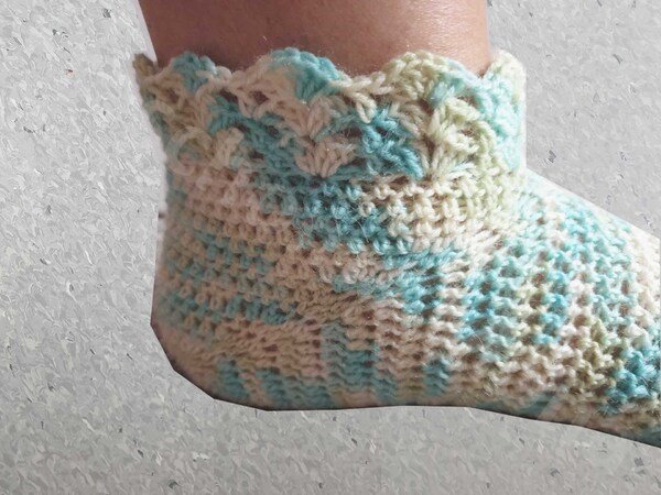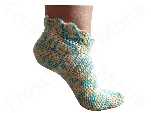 Ich zeige dir das Häkeln der Socke, so wie auf dem Galeriebild dargestellt als Kurzsocke mit hübscher Abschlussborte.