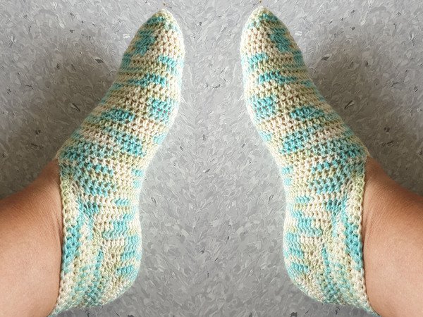 Aufgrund der Art und Weise, wie diese Socken gehäkelt werden, kannst du sie für alle Fußgrößen anpassen.