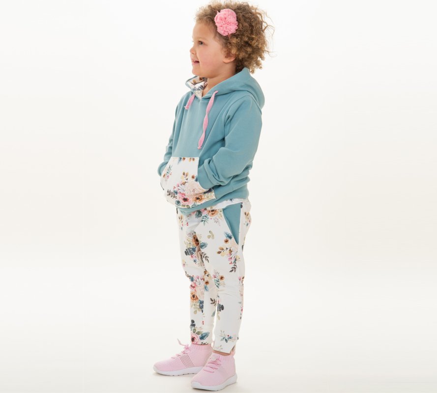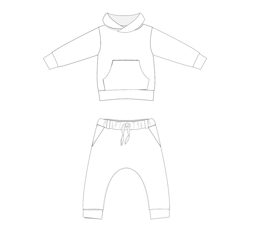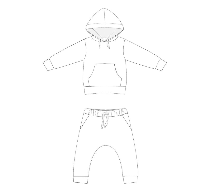 Mit diesem digitalen Schnittmuster-Set nähst du ein modernes und gemütliches Kinder-Outfit für Mädchen und Jungen: einen Hoodie mit Känguru-Tasche und eine bequeme Jogginghose. Der Hoodie bietet zwei Varianten zur Auswahl – mit gefütterter Kapuze oder mit Schalkragen. Die Hose ist lässig geschnitten, hat einen elastischen Bund und seitliche Eingrifftaschen. Besonders angenehm: Die Vorderseite ist ohne Mittelnaht gestaltet und sorgt so für extra Komfort beim Spielen und Toben. Ideal für Herbst, Winter und Frühling – je nach Stoffwahl auch ganzjährig tragbar.