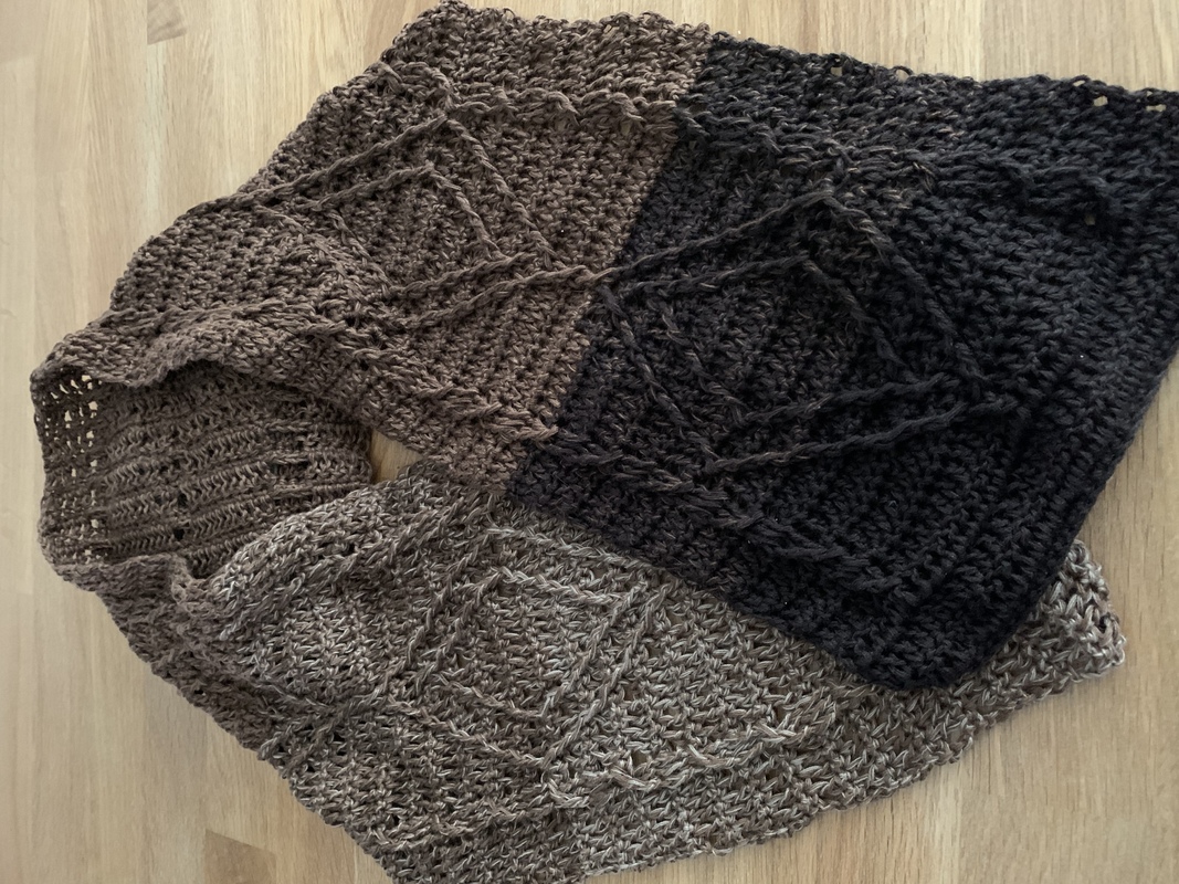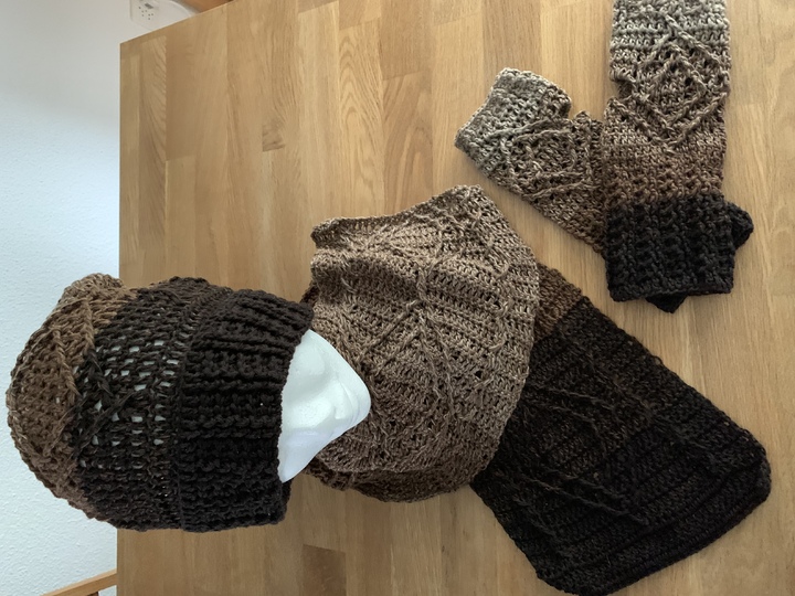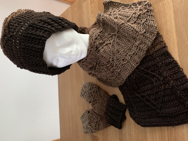 anhand dieser Anleitung kann das Häkelset Herbstwärme bestehend aus Mütze Stulpen Schal nachgearbeitet werden,