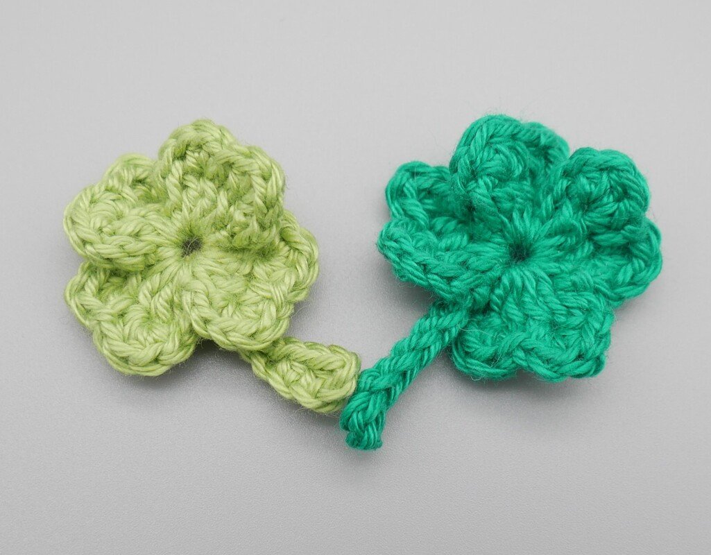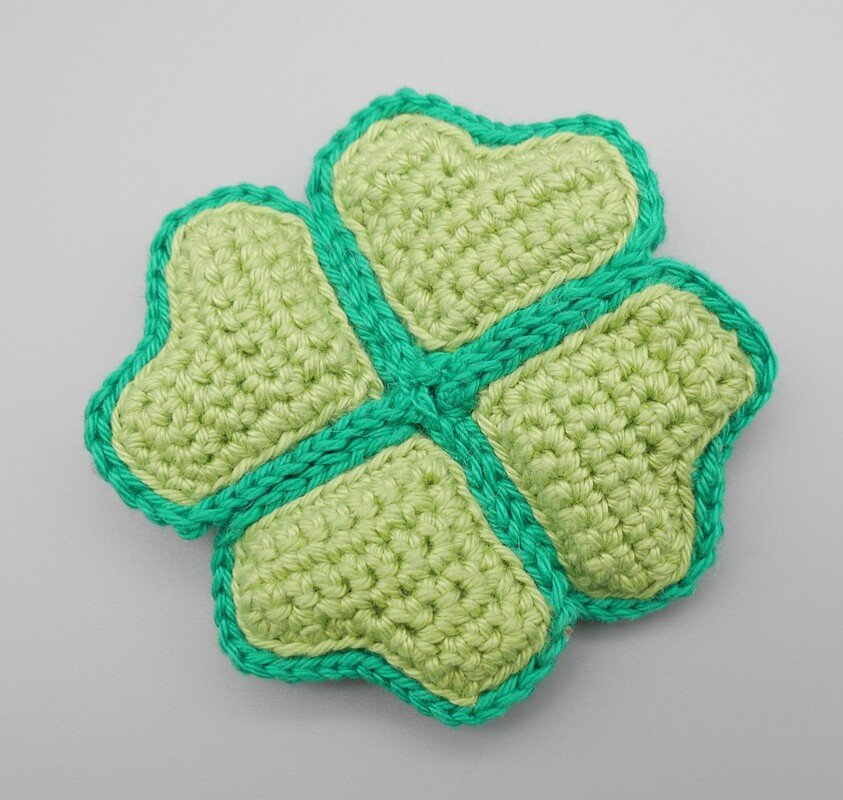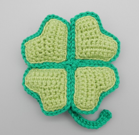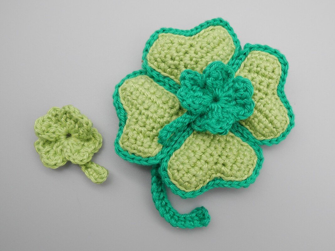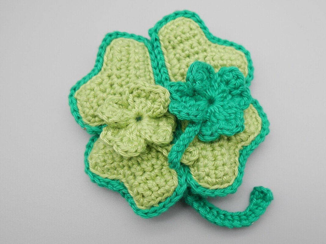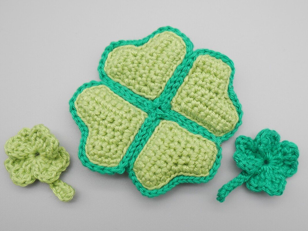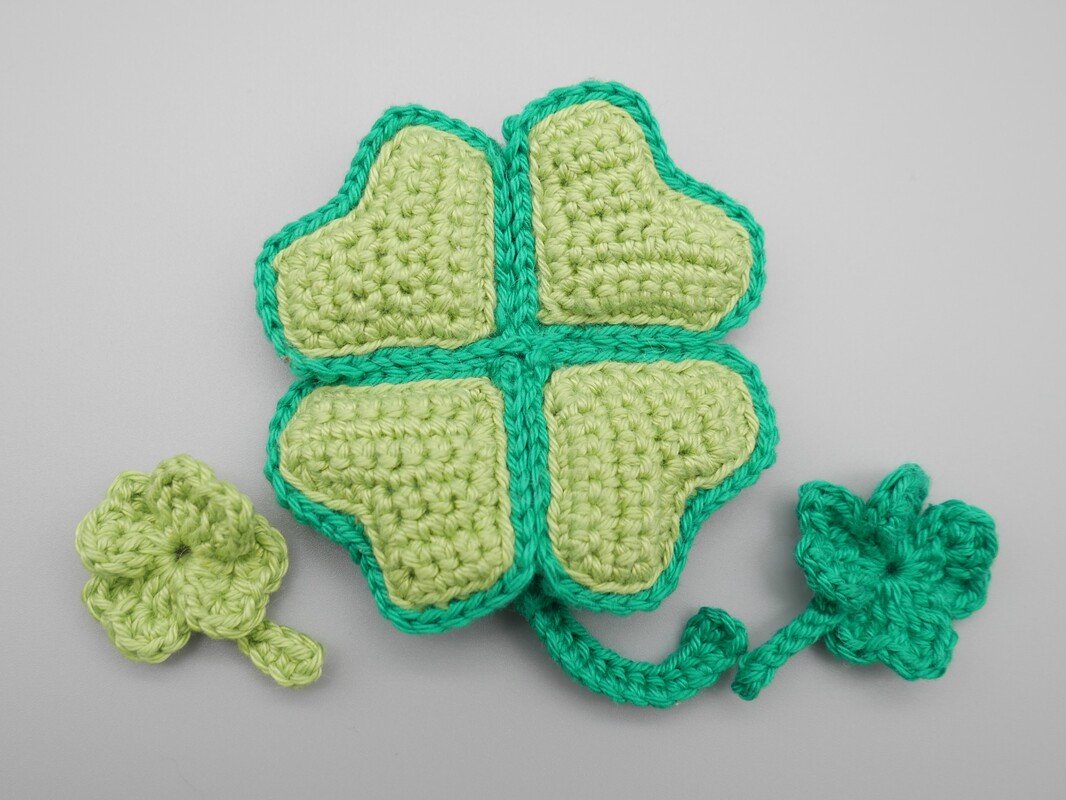 Glücksbringer Kleeblätter in zwei Größen. Das Große Kleeblatt mit oder ohne Stengel ist in 3 D Optik. Kleinere zum aufnähen oder solo zu verschenken. In jedem Fall ein persönlicher Glücksbringer fürs neue Jahr.