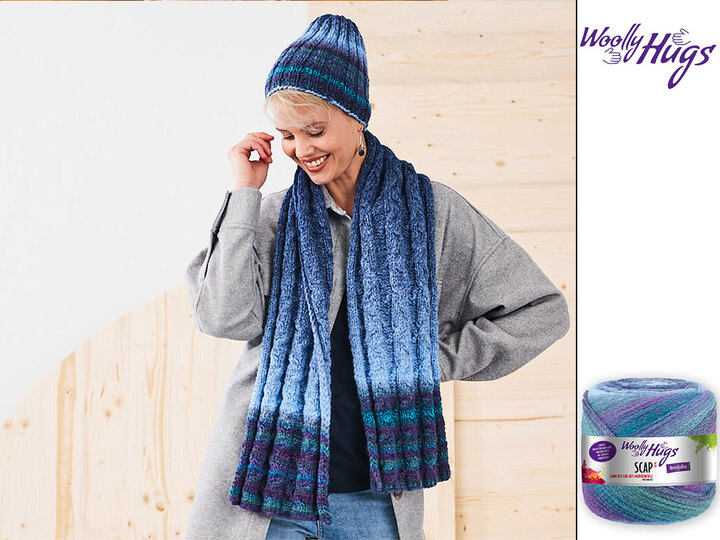 Das Garn "Woolly Hugs SCAP" hat einen ganz besonderen Farbverlauf den man sonst nirgends bekommt. Ein kleines Stück ist bunt, der Rest verläuft in einem langen Verlauf aus. Alle Knäule sind gleich, so das man immer wieder ein neues Knäuel ansetzen kann.