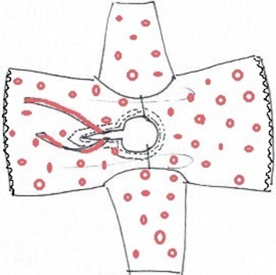Im Schnittmuster sind die 11 Einzelgrößen 80, 86, 92, 98, 104, 110, 116, 122, 128, 134 und 140 in verschiedenen Farben eingezeichnet. Weil die Schnittteile größer sind als Din A 4, sind sie unterteilt, Sie kleben Sie an den angezeichneten Linien zusammen.