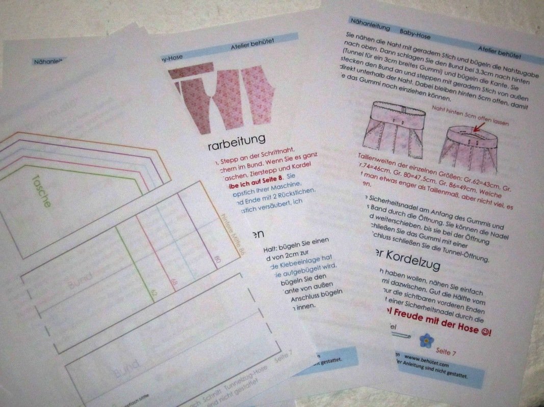 Im Schnittmuster sind die 5 Einzelgrößen 62, 68, 74, 80 und 86 eingezeichnet, jede Größe in einer anderen Farbe. Drei Schnittteile sind größer als ein DinA4-Blatt, Sie setzten sie an den vorgesehenen Linien zusammen.